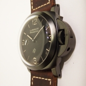 簡述: Luminor 1950 3 Day - 47mm 3日鏈腕錶/ 型號:PAM00617/ R 字頭限量製作300只/ 採自製編號:P.3000 手上鏈機芯, 厚:5.3mm,16 1/2法分, 21石, 2 個發條盒,Glucydur平衡擺輪,每小石震頻 21,600次,Incabloc防震裝置,完全由PANERAI研製/ 具時ˋ分ˋ指示/ 黑色面盤, 6 點方位 OP 創廠 LOGO / 舊化處理夜光指針及時標,具夜光效果/ 錶徑: 47 mm/ 鈦合金包覆 DLC 錶殼/ 大ㄇ型(普通型)鋼質扣頭/ 特殊專利龍頭護橋(上有REG. 及 T.M.字樣,側面有 1950 字樣)/ 金魚缸式圓弧形藍寶石玻璃/ 防水達100米/ 搭配原廠深咖啡色舊化處理牛皮錶帶(上刻印有 OP LOGO)及黑色橡膠錶帶各 1 條方便自行拆換.