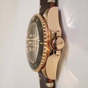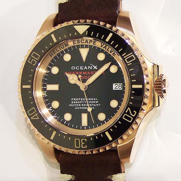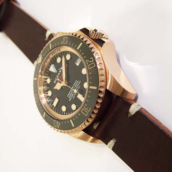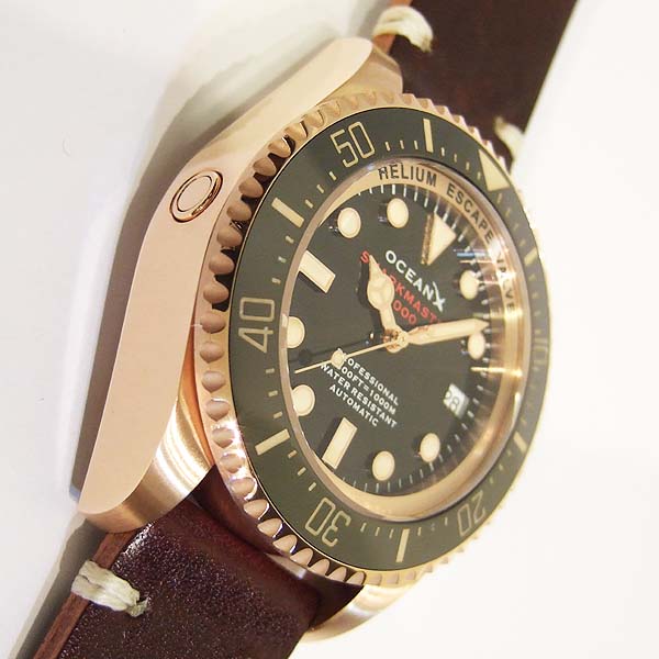 簡述: OCEAN 潛水腕錶/ 型號:SMS1001/ 採 SEIKO NH35 自動上鏈機芯,動力儲存約:41小時, 24 顆紅寶石,28800vph/ 黑色錶盤/ 具時ˋ分ˋ秒指示,3點方位日期顯示窗/ 夜光立體時標及標誌線時標/ 可單向旋轉黑色陶瓷潛水錶圈,可計算入水時間/ 手錶尺寸: 44 mm,厚:15.5mm/ 藍寶石水晶玻璃/ 全錶 316 L 鋼材質(PVD玫瑰金色),錶殼左側有排氦氣閥/ 搭配原廠咖啡色牛皮錶帶及 ㄇ型一般穿扣/ 防水 1000 米.