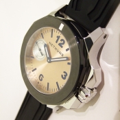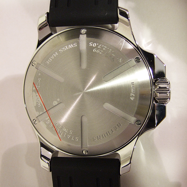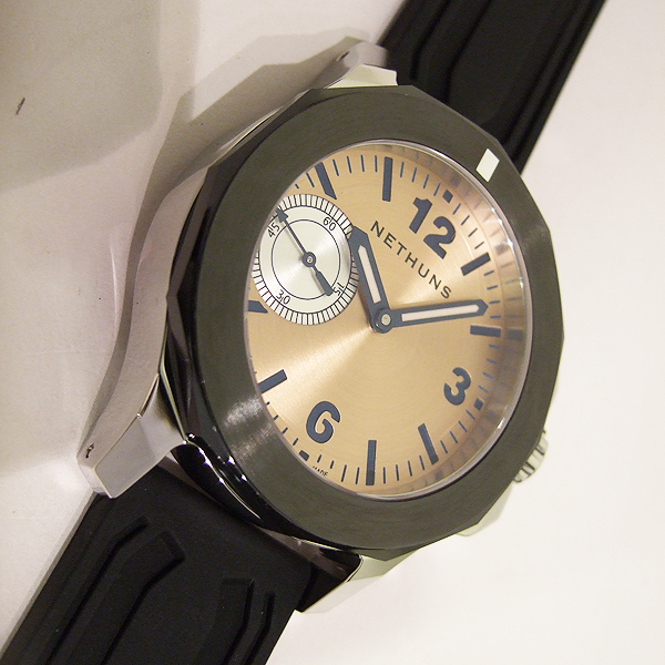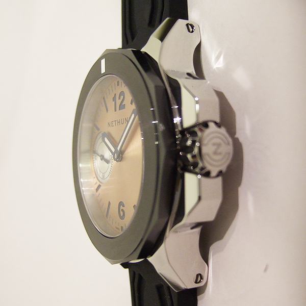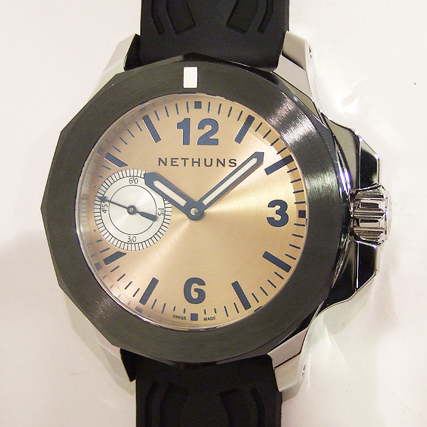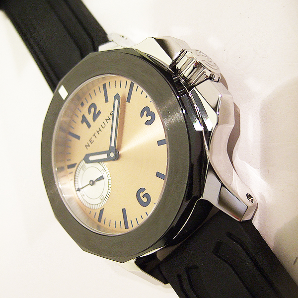 簡述: NETHUNS 義大利品牌潛水腕錶/ 限量199只/ 型號:7.1.2.7.05/ 採瑞士 Unitas 6497手上鏈機芯/ 機芯為:17石ˋ動力儲存:46小時/ 具時ˋ分ˋ指示/ 金色三明治面盤/ 深藍色阿拉伯數字時標及標誌線時標(具夜光效果)/ 藍色指針(具夜光效果)/ 黑色陶瓷可單向旋轉潛水外圈,可計算入水時間/ 手錶尺寸: 47mm錶徑/ 防炫藍寶石水晶玻璃鏡面/ 霧面鋼錶底蓋,厚:3.7mm/ 搭配 24mm 原廠黑色橡膠錶帶/ ㄇ字型鋼質錶扣/ 防水: 300米.