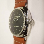 簡述: Radiomir Black Seal 腕錶/ 型號:PAM-00183/ K 字頭限量 1500 只/ 採用Panerai OP XI 手動上鏈機芯/ 機芯為:每小時擺率 28800次ˋIncabloc防震裝置ˋ 動力儲存約42 小時ˋ日納瓦波紋打磨ˋ獲天文台認證/ 具時ˋ分ˋ小秒針顯示/ 黑色錶面(三明治錶面,12 點方位 BLACK SEAL 字樣為最大特色)/ 錶殼45mm 316L 拋光精鋼質/ 搭配替代用棕色牛皮錶帶及原廠ㄇ型(一般)鋼質錶扣/ 藍寶石水晶鏡面/ 防水達100米.