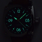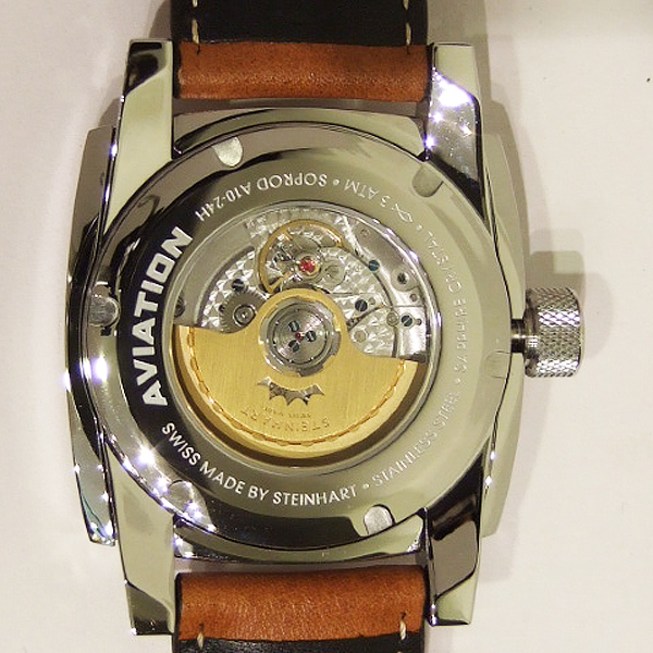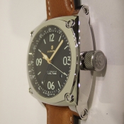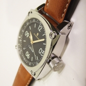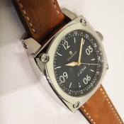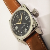 簡述: Aviation Dual Time Premium/ 型號:106-0501 / 採瑞士 ETA 2893-2 自動上鏈機芯/ 機芯為:25石,動力儲存:42小時/ 具時ˋ分ˋ秒指示/ 4~5點間日期視窗/ 黑色面盤/ 阿拉伯數字及標誌線時標/ 金色邊夜光指針/ 手錶尺寸: 44mm 錶徑,厚:14.8mm,重:140克/ 藍寶石水晶玻璃/ 透明錶底蓋/ 搭配 24mm 原皮色皮錶帶/ ㄇ字型鋼質錶扣/ 防水: 30米.