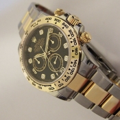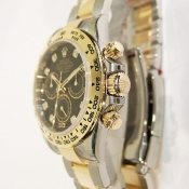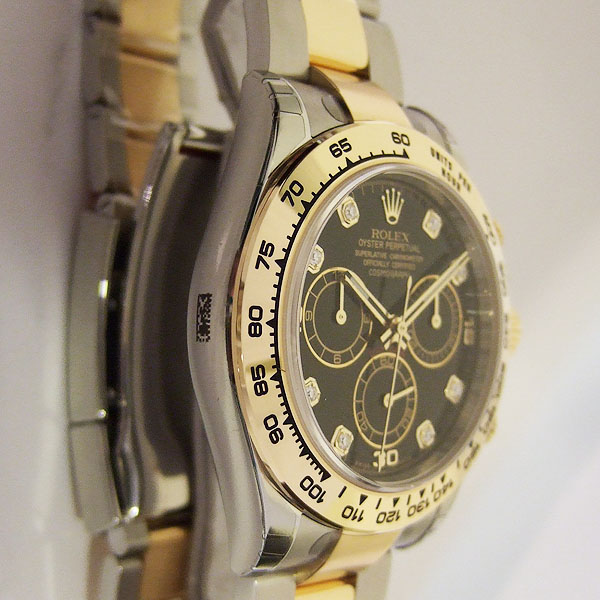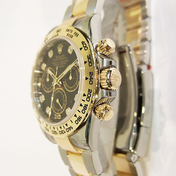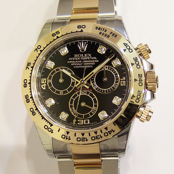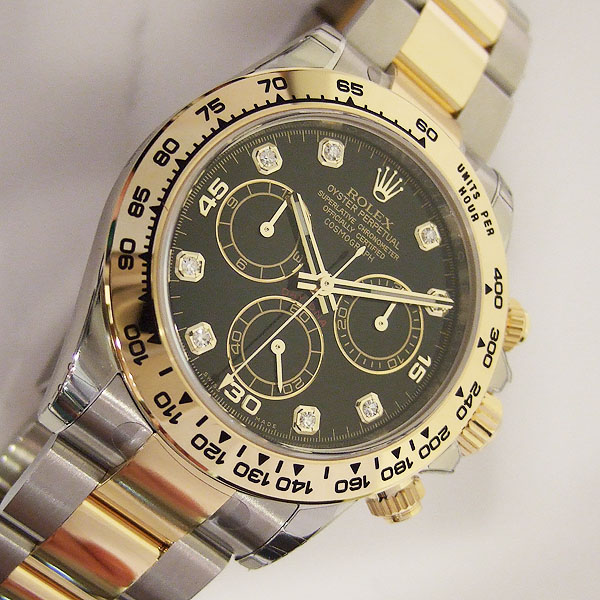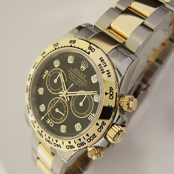 勞力士蠔式宇宙計型迪通拿腕錶/ 型號:116505/ 亂碼字頭(有防偽 ROLEX 字樣及流水號碼內圈)/ 18K 黃金& 904L 不銹鋼天文台錶/ 採自動上鏈機芯,機芯為:Cal:4130ˋ鍍銠機芯有魚鱗紋及日內瓦波紋打磨ˋ44顆紅寶石ˋ五方位調校ˋKIF避振裝置ˋ四臂環形合金擺ˋ、無快慢針由四顆螺絲微調快慢ˋ雙層合金游絲ˋ橫跨式橋板ˋ由柱狀星形凸輪控制計時碼錶的啟動.停止.歸零ˋ雙向自動上鏈/ 蠔式摺疊扣錶帶/ 具時ˋ分ˋ秒指示及計時碼錶功能/ 刻有分度外圈方便即時計時速度ˋ生產速度等/ 旋入式表冠及旋轉按鈕錶冠/ 自動上鏈/ 黑色錶面, 8 顆原鑲鑽石刻度/ 金色標線及指針(具夜光效果)/ 藍寶石水晶鏡面/ 蠔式錶帶及新款折疊式錶扣/ 防水深達:100米.