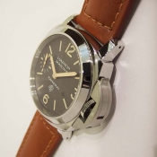 沛納海 Luminor Base 商標基本款專賣店限定款/ 型號:PAM00632/ T 字頭限量1000只/ 採Panerai OP I 手上鏈機芯/ 機芯為:16 1/2法分ˋ17石ˋ單一金屬Glucydur擺輪ˋ每小時擺率21600次ˋIncabloc防震裝置ˋ動力儲存約56小時/ 具時ˋ分ˋ秒指示/ 錶殼 44mm 亮面316L鋼材質/ 嵌入式錶底蓋/ 磨砂特殊龍頭護橋(PANERAI專利)/ 菸草色錶盤,夜光時標及阿拉伯數字, 6 點方位白色 OP 創廠 LOGO/ 藍寶石水晶玻璃,厚度3.5毫米,抗反光塗層/ 防水達100米/ 附原廠棕色牛皮錶 1 條/ 配大型精鋼錶扣.