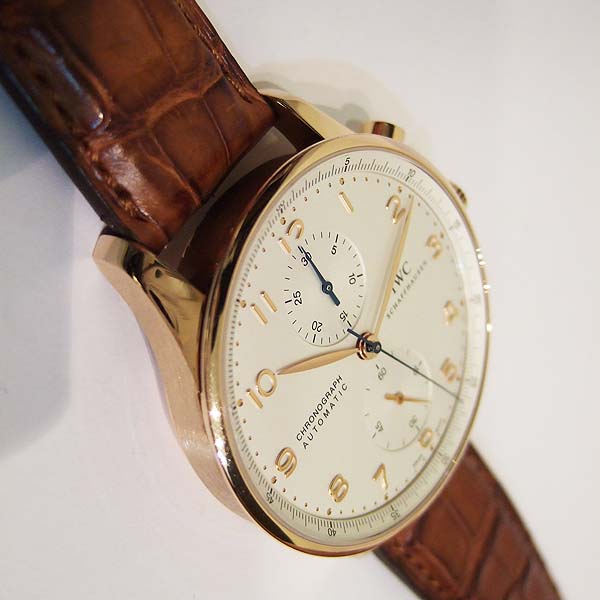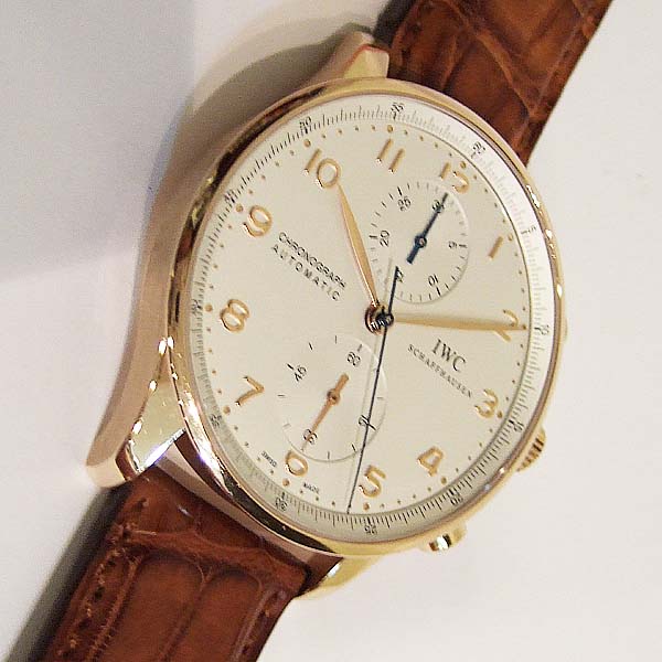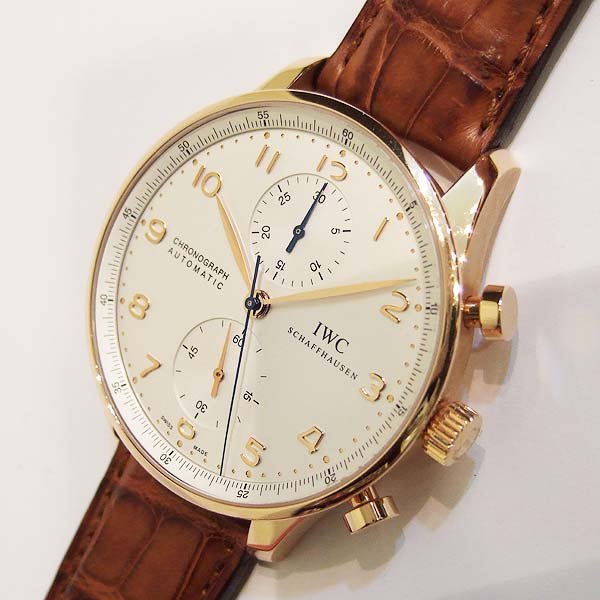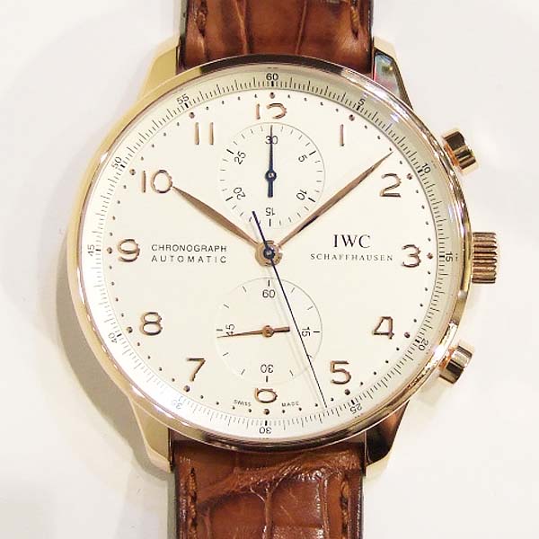 葡萄牙計時腕錶 / 型號:IW371480 / 錶殼 18 K 玫瑰金材質/ 採用IWC自製自動上鏈機芯,編號:79350,機芯為:Glucydur合金擺輪,動力儲存 44 小時/ 具時ˋ分ˋ秒指示,30分鐘又60秒計時碼錶功能/ 錶徑尺寸:40.9mm/ 白色錶面/ 柳葉型金色指針/ 金色阿拉伯數字及標誌型時標/ 藍寶石水晶鏡面 / 原廠咖啡色鱷魚皮帶及 18 K 玫瑰金穿扣/ 日常生活防水30米.