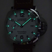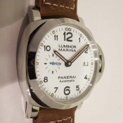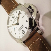 Luminor 1950 Marina 3 Day 自動腕錶/ 型號:PAM-01499/ T 字頭限量1000只(可快拆式錶帶)/ 採用Panerai P.9010 自動上鏈機芯/ 機芯為:13 3/4 法分ˋ 28石ˋ 每小時擺率 28800次ˋ Incabloc防震裝置ˋ 動力儲存 3 日/ 具時ˋ分ˋ小秒針ˋ日期顯示/ 錶殼44mm 316L 拋光及霧鋼材質/ 白色錶面/ 夜光時標及指針/ 藍寶石水晶鏡面/ 防水達300米/ ㄇ型錶扣/ 附原廠黑色膠帶及棕色牛皮錶帶.
