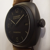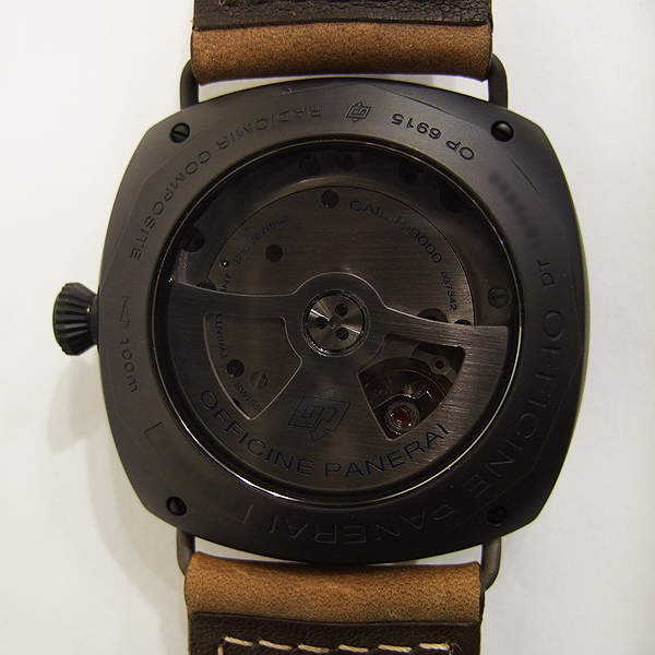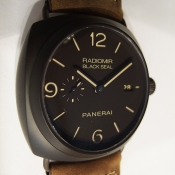 Radiomir 系列 BLACK SEAL 腕錶/ 型號:PAM-00505/ 0 字頭限量製作2000只/ 採自製編號:P.9000 自動上鏈機芯,2 個發條盒,動力儲存 3 天,完全由 PANERAI研製/ 具時ˋ分ˋ小秒指示, 3 點方位日期顯示窗/ 三明治式刻度鏤空暗棕色(菸草色)面盤/ 舊化處理夜光指針及時標/ 錶徑: 45 mm/ 陶化鋁複合材質錶殼/ 藍寶石水晶玻璃鏡面及透明後底蓋/ 防水達100米/ 搭配原廠身咖啡色作舊牛皮錶帶/ 陶化鋁複合材質ㄇ型(普通型)扣頭.