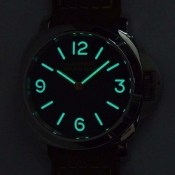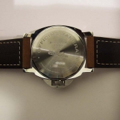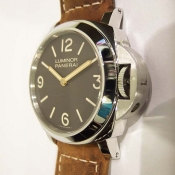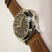 簡述: 沛納海 Luminor Marina Boutique 限定版/ 型號:PAM 00390/ N 字頭限量 2000 只/ 採Panerai OP I 手上鏈機芯/ 機芯為:16 1/2法分ˋ17石ˋ單一金屬Glucydur擺輪ˋ每小時擺率21600次ˋIncabloc防震裝置ˋ動力儲存約 56 小時/ 錶殼 44mm 亮面 316L 鋼材質/ 特殊專利龍頭護橋/ 菸草色面盤,金色指針及時標(舊化感處理),錶背刻印有潛艇載具(人豬)雕刻/ 藍寶石水晶玻璃(厚度3.5毫米),具抗反光塗層/ 防水達300米/ 附原廠棕色舊化處理牛皮錶帶.