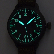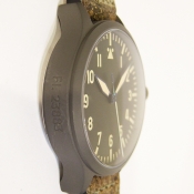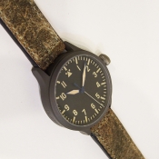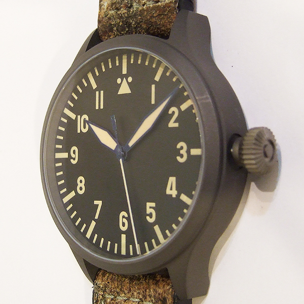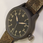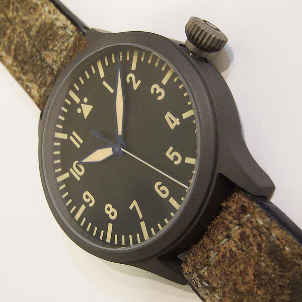 Steinhart 德國品牌軍錶/ Nav B-Uhr II VINTAGE TITANIUM 系列飛行員軍錶/ 型號: 107-0402/ 採瑞士 ETA2824-2 自動上鏈機芯/ 機芯為:25石ˋ動力儲存約:42小時/ 具時ˋ分ˋ秒指示/ 煙草色面盤/ 阿拉伯數字及標誌線時標/ 藍色邊緣指針(具夜光效果)及時標/ 鈦合金霧面噴砂舊化處理錶殼,鋼質後底蓋/ 大型軍錶錶冠/ 錶背刻有使用之材質ˋ機芯表/ 手錶尺寸: 47mm 錶徑ˋ厚:14.2mmˋ重 103 公克 / AR 塗層藍寶石水晶玻璃鏡面/ 搭配 22mm 軍綠色彷舊處理錶帶/ ㄇ字錶扣/ 防水: 30米.