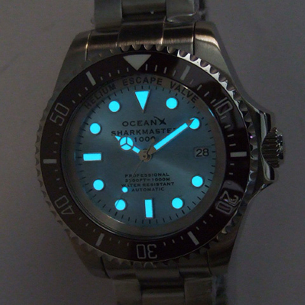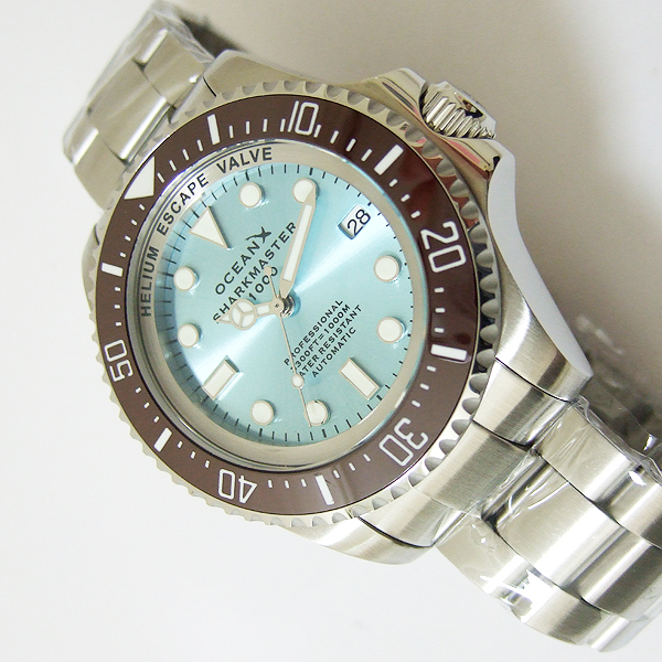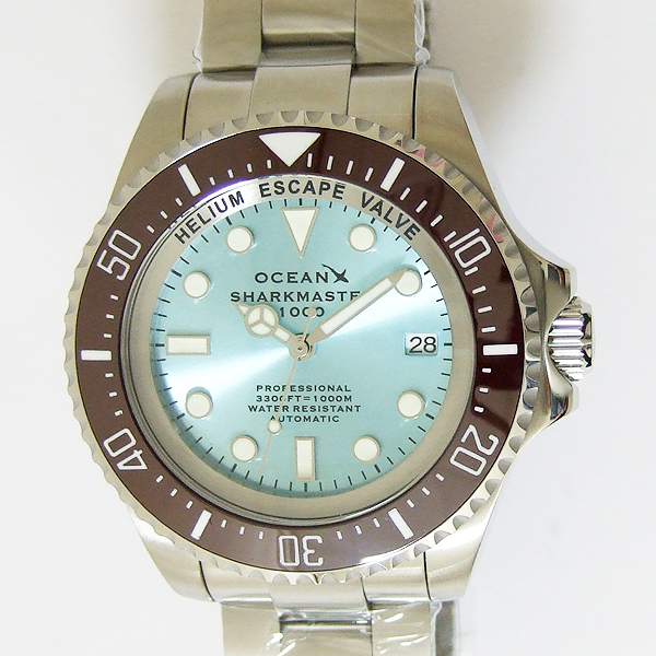 SHARKMASTER 1000 潛水腕錶/ 型號:SMS1015/ 採 SEIKO NH35 自動上鏈機芯,動力儲存約:41小時, 24 顆紅寶石,28800vph/ 冰藍色錶盤/ 具時ˋ分ˋ秒指示,3點方位日期顯示窗/ 冷光藍夜光立體時標及標誌線時標/ 可單向旋轉咖啡色陶瓷潛水錶圈,可計算入水時間/ 手錶尺寸: 44 mm,厚:17.1mm/ 藍寶石水晶玻璃/ 全錶 316 L 鋼材質,錶殼左側設有排氦氣閥/ 搭配原廠鋼質鏈帶及折疊式錶扣/ 防水 1000 米.