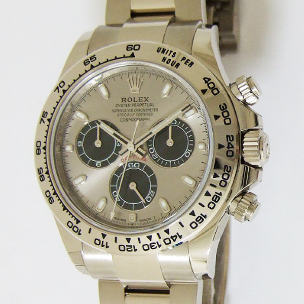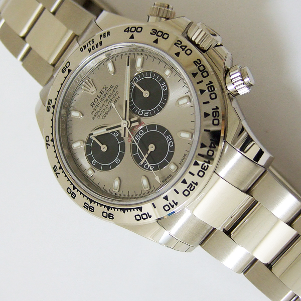 勞力士蠔式宇宙計型迪通拿腕錶/ 型號:116509/ 亂碼字頭(有防偽 ROLEX 字樣及流水號碼內圈)/ 18K 白金天文台錶/ 採自動上鏈機芯,機芯為:Cal:4130ˋ鍍銠機芯有魚鱗紋及日內瓦波紋打磨ˋ44顆紅寶石ˋ五方位調校ˋKIF避振裝置ˋ四臂環形合金擺輪ˋ無快慢針由四顆螺絲微調快慢ˋ雙層合金游絲ˋ橫跨式橋板ˋ由柱狀星形凸輪控制計時碼錶的啟動.停止.歸零ˋ雙向自動上鏈/ 蠔式摺疊扣錶帶/ 具時ˋ分ˋ秒指示及計時碼錶功能/ 刻有分度外圈方便即時計時速度ˋ生產速度等/ 旋入式表冠及旋轉按鈕錶冠/ 自動上鏈/ 金屬銀灰色錶面/ 立體標誌型時標及指針,具夜光效果/ 藍寶石水晶鏡面/ 蠔式錶帶及新款折疊式錶扣/ 防水深達:100米.