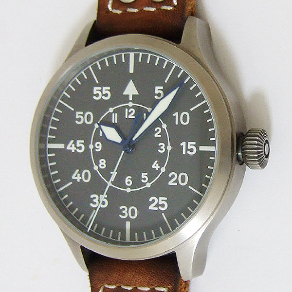 Nav B-Uhr 47 Titan B-Type Central Second 飛行員軍錶/ 型號: 107-0738 採瑞士 ETA Unitas 6497-1 手動上鏈機芯/ 機芯為:18石ˋ動力儲存約:42小時/ 具時ˋ分ˋ秒指示,停秒功能/ 炭泥灰色 B-Type 面盤/ 阿拉伯數字及標誌線時標(具夜光效果)/ 藍色邊緣指針(具夜光效果)及時標/ 鈦合金霧面噴砂舊化處理錶殼,鋼質後底蓋/ 大型軍錶錶冠/ 透明錶背,清楚鑑賞原廠自製將 6497-1 自製成為大 3 針自動機芯的功力/ 手錶尺寸: 47mm 錶徑ˋ厚:14.0mmˋ重 105 公克 / 藍寶石水晶玻璃鏡面/ 搭配 22mm 深咖啡色彷舊處理鉚釘錶帶/ ㄇ字錶扣/ 防水: 30米.