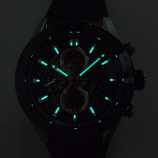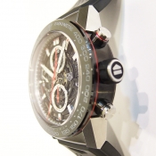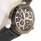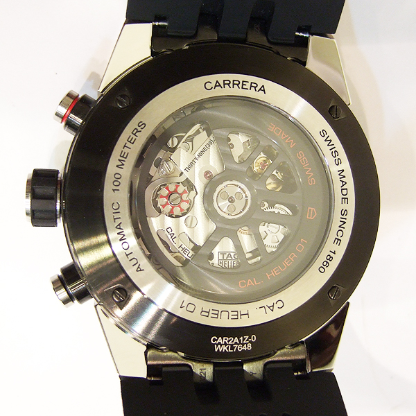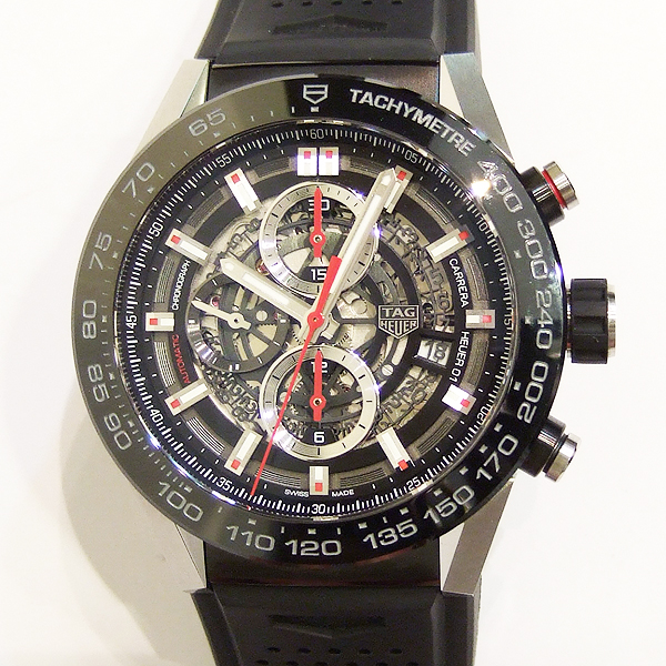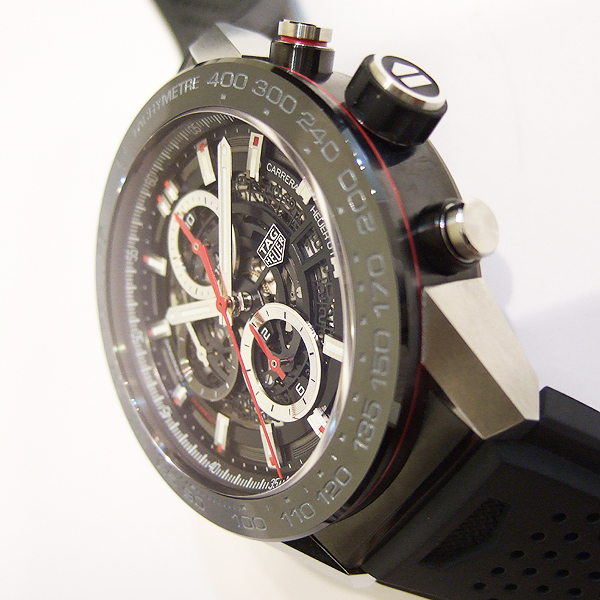 TAG HEUER CARRERA 計時碼錶/ 型號:BZ79-BHHW-SYGF/ 採原廠 Calibre Heuer 01 自動上鏈機芯/ 具時ˋ分ˋ秒指示/ 計時碼錶功能/ 鏤空面盤/ 銀色標誌線時標/ 劍型銀色指針/ 黑色陶瓷計速表圈/ 鋼及黑色陶瓷霧面拋光處理錶殼/ 大型錶冠/ 手錶尺寸: 45mm 錶徑 / 防眩藍寶石水晶玻璃鏡面/ 透明後底蓋/ 搭配 29mm 原廠黑色橡膠錶帶(透氣孔設計)及黑色碳化鈦塗層鈦金屬摺疊錶扣,安全按鈕處理折疊式錶扣/ 防水: 100米.