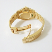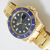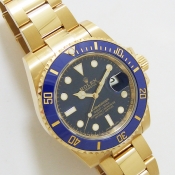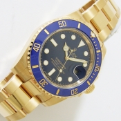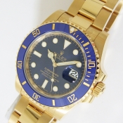 Submariner 蠔式 18 K黃金陶瓷合金潛水錶/ 型號:116618LB/ 亂碼字頭/ 採自動上鏈機芯/ 機芯編號:3135, 採用新研發的寶璣式雙層鈮鋯合金藍色鋼,具抗磁效果,31石,五方位調校,雙層合金游絲,四臂環形合金擺輪,四顆微調快慢螺絲,KIF避振裝置,天文台認證(C.O.S.C.)/ 錶徑40mm/ 具時ˋ分ˋ秒針指示及日期放大鏡顯示/ 藍色面盤/ 夜光指針及時標/ 藍色陶瓷合金單向旋轉潛水計時外圈/ 錶盤內圈刻有一圈防偽 ROLEX 字樣及流水號碼/ 藍寶石水晶玻璃鏡面/ 原廠18 K 黃金鏈帶及折疊式錶扣/ 防水深達 300 米.