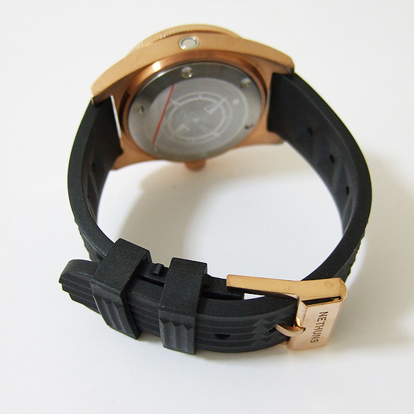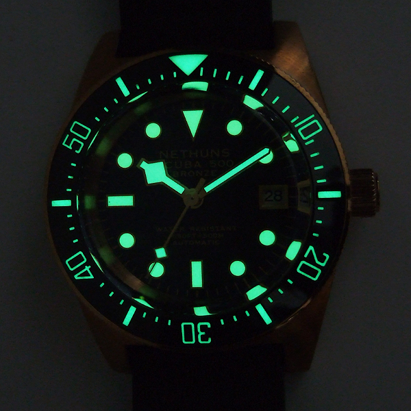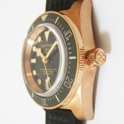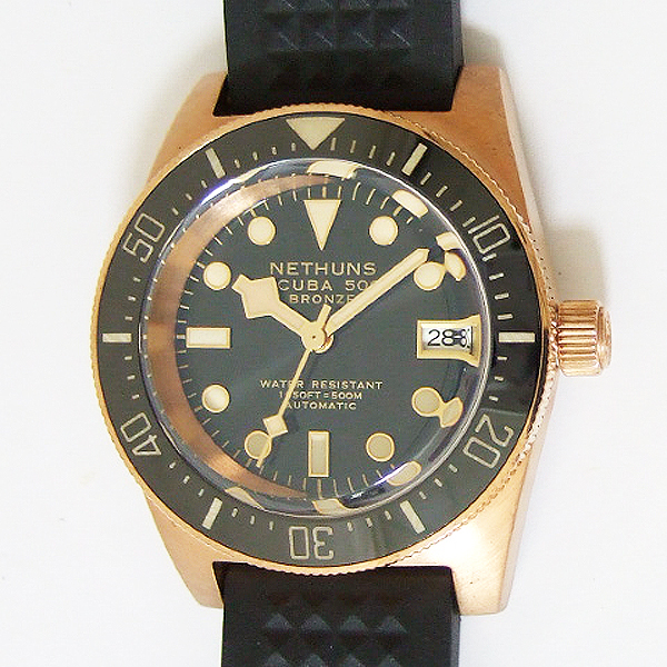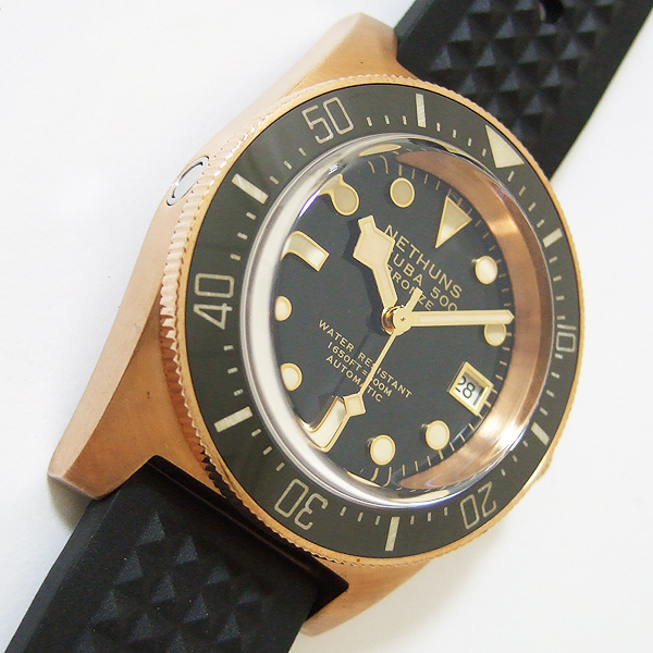 簡述: NETHUNS 義大利品牌 SCUBA 500米 潛水腕錶/ 型號:SB521/ 採日本精工 NH35 自動上鏈機芯/ 機芯為:24石ˋ動力儲存約:40小時/ 具時ˋ分ˋ秒指示, 3 點方位日期窗/ 黑色面盤/ 金色斧型指針,舊化立體時標(具夜光效果)/ 青銅材質錶殼,錶冠於 3 點方位,排氦筏 9 點方位/ 舊化金色邊賓士型指針(具夜光效果)/ 黑色陶瓷可單向旋轉潛水外圈,可計算入水時間/ 手錶尺寸: 42mm錶徑/ 藍寶石水晶玻璃鏡面/ 霧面鋼錶底蓋,刻有序號/ 搭配 22mm 原廠黑色橡膠錶帶/ ㄇ字型一般鋼質PVD青銅色穿扣/ 防水: 500米.