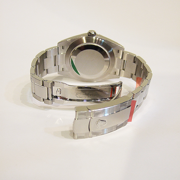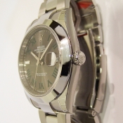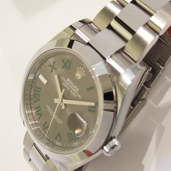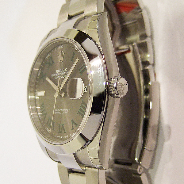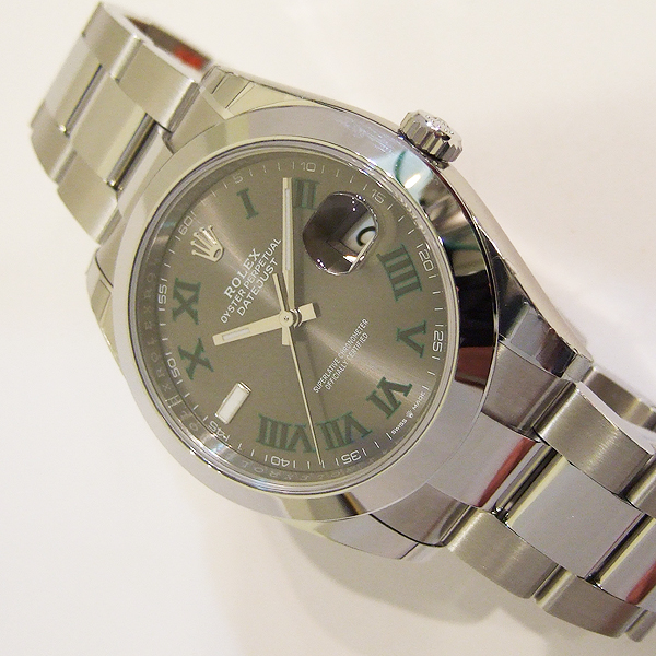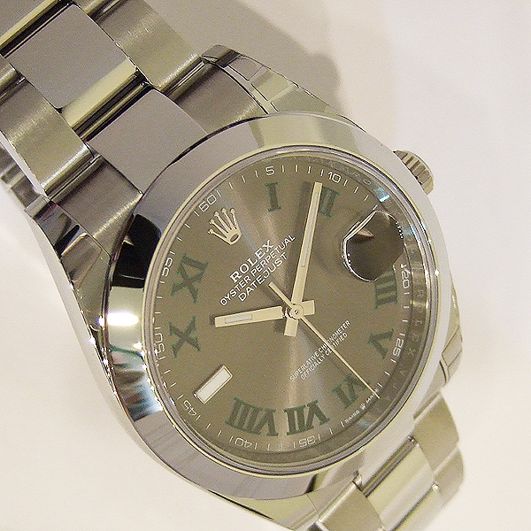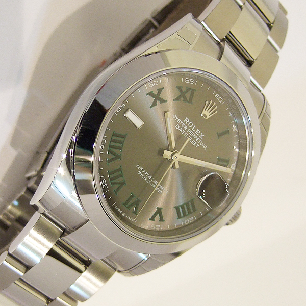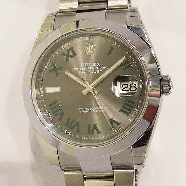 勞力士蠔式 DATEJUST II 腕錶/ 型號:126300/ 亂碼字頭/ 採自動上鏈機芯/ 機芯編號:3235, 採用新研發的 CHRONERGY 擒縱系統,五方位調校,配備 PARACHROM游絲的平衡擺輪,四臂環形合金擺輪,四顆微調快慢螺絲,KIF避振裝置,天文台認證(C.O.S.C.)/ 錶徑41mm/ 具時ˋ分ˋ秒針指示及日期放大鏡顯示/ 灰色金屬光面盤搭配綠色羅馬數字刻度/ 夜光指針及時標/ 錶盤內圈刻有一圈防偽 ROLEX 字樣及流水號碼/ 藍寶石水晶玻璃鏡面, 3 點方位設有放大鏡/ 原廠不鏽鋼蠔式鏈帶及折疊式錶扣/ 防水達 100 米.