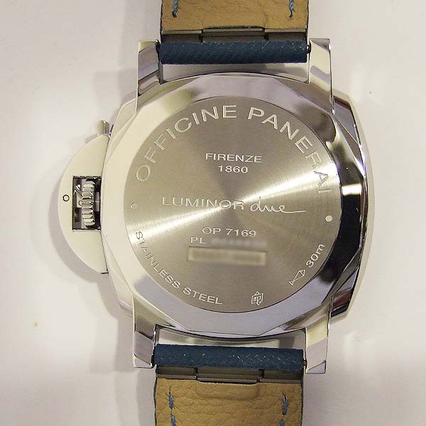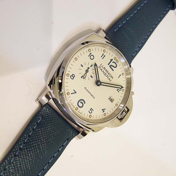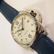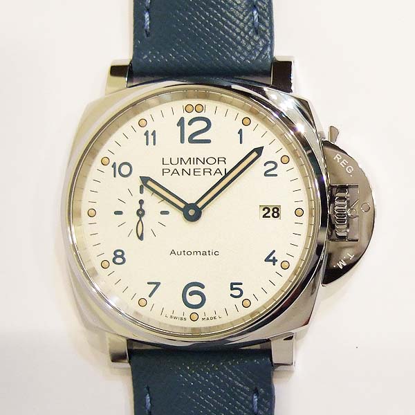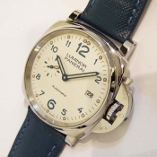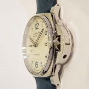 簡述: Luminor Due 1950 3 Day - 42mm 自動腕錶/ 型號:PAM00906/ V 字頭限量 2000 只(按壓式快拆錶帶)/ 採用 Panerai OP XXXIV 自動上鏈機芯/ 動力儲存 3 日/ 具時ˋ分ˋ小秒針ˋ日期顯示/ 錶殼42mm 316L 拋光及霧鋼材質/ 白色錶面/ 藍色阿拉伯數字時標,舊化處理夜光圓點時標及指針(具夜光效果)/ 藍寶石水晶鏡面/ 日常生活防水 30米/ 小ㄇ型錶扣/ 附原廠藍色牛皮錶帶.