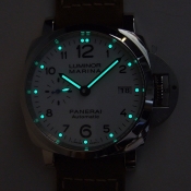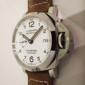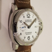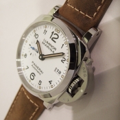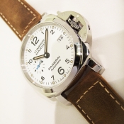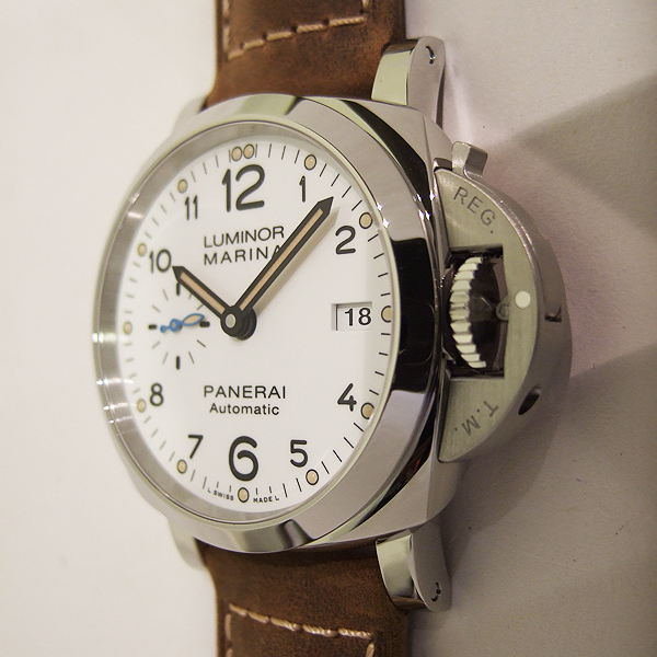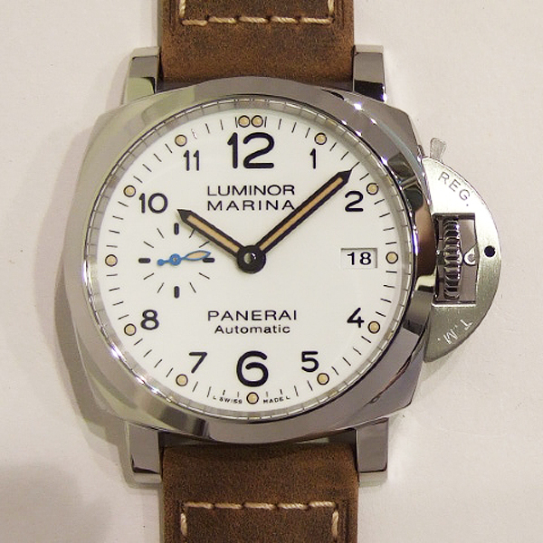 簡述: Luminor Due 1950 3 Day - 42mm 自動腕錶/ 型號:PAM01523/ U 字頭限量 1000 只/ 採用 Panerai P.9010 自動上鏈機芯/ 動力儲存 3 日/ 具時ˋ分ˋ小秒針ˋ日期顯示/ 錶殼42mm 316L 拋光及霧鋼材質/ 白色錶面/ 黑色阿拉伯數字時標,舊化處理夜光圓點時標及指針(具夜光效果), 9 點方位設置小秒針盤,秒針描藍邊/ 藍寶石水晶鏡面/ 日常生活防水 100米/ 小ㄇ型錶扣/ 附原廠棕色牛皮錶帶.