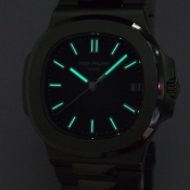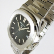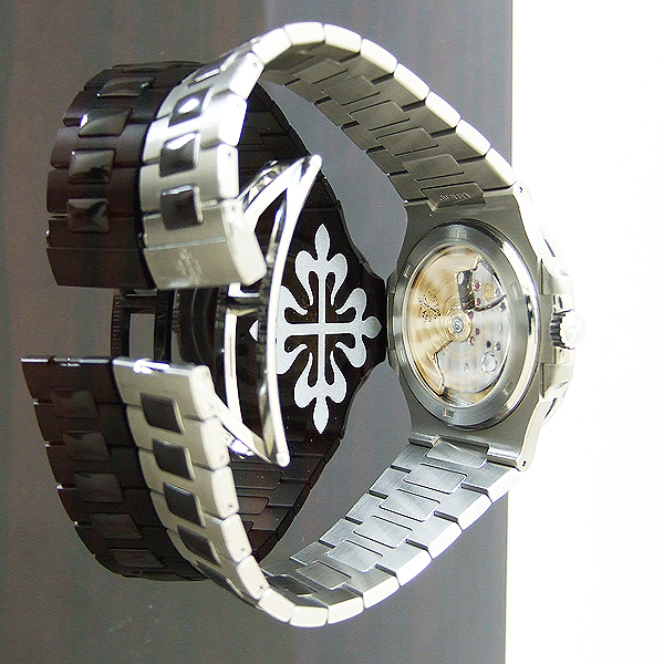 P.P. 百達翡麗 Nautilus 男裝腕錶/ 型號:5711/1A-010/ 採原廠編號:324 S C 自動上鏈機芯,機心為:29石,P.P.印記/ 具時ˋ分ˋ秒指示,3 點方位日期顯示窗/ 錶徑:42mm/ 藍色橫紋面盤/ 銀色立體刻度時標,有夜光功能/ 藍寶石水晶玻璃鏡面/ 原廠鏈帶及折疊式錶扣/ 透明錶底蓋/ 防水 120 米.