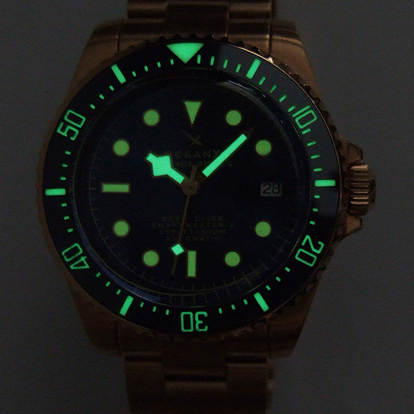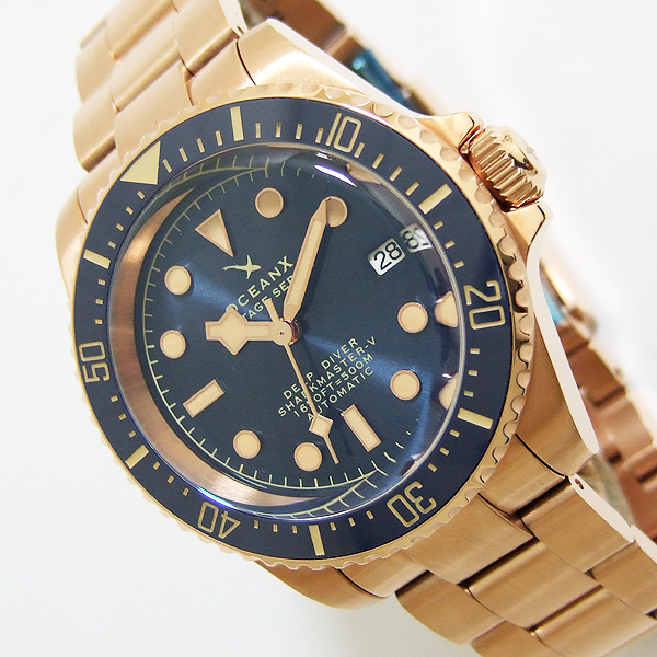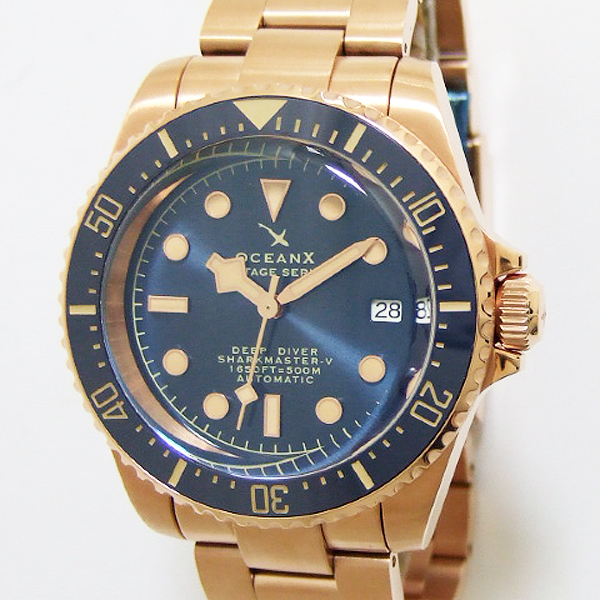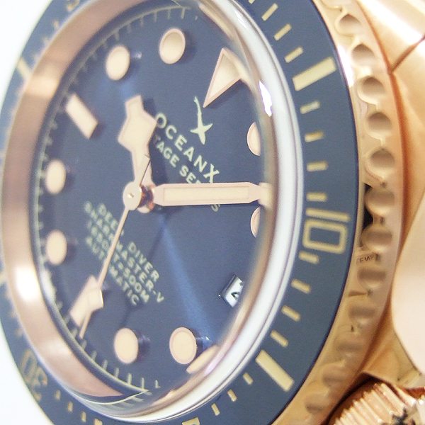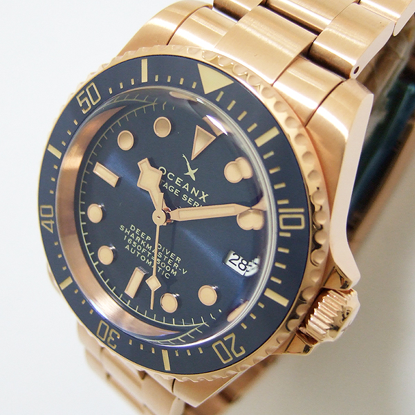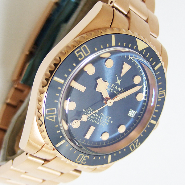 OCEANX 潛水腕錶/ 型號:VSMS512/ 採 SEIKO NH35 自動上鏈機芯,動力儲存約:41小時, 24 顆紅寶石,21600vph/ 藍色錶盤/ 具時ˋ分ˋ秒及 3 點方位日期視窗/ 舊化夜光時標及標誌線時標/ 可單向旋轉藍色陶瓷潛水錶圈,可計算入水時間/ 手錶尺寸: 42 mm,厚:15.3mm/ 藍寶石水晶玻璃/ 全錶 316 L 鋼材質 PVD 玫瑰金色/ 搭配原廠鋼質鏈帶及折疊式錶扣/ 防水 500 米.