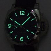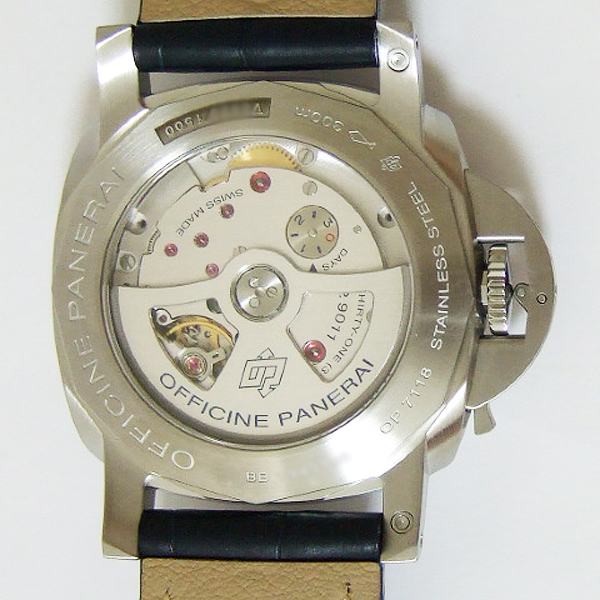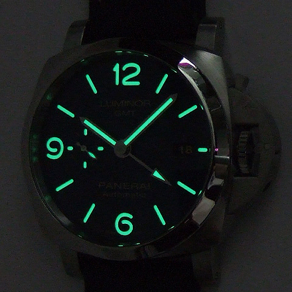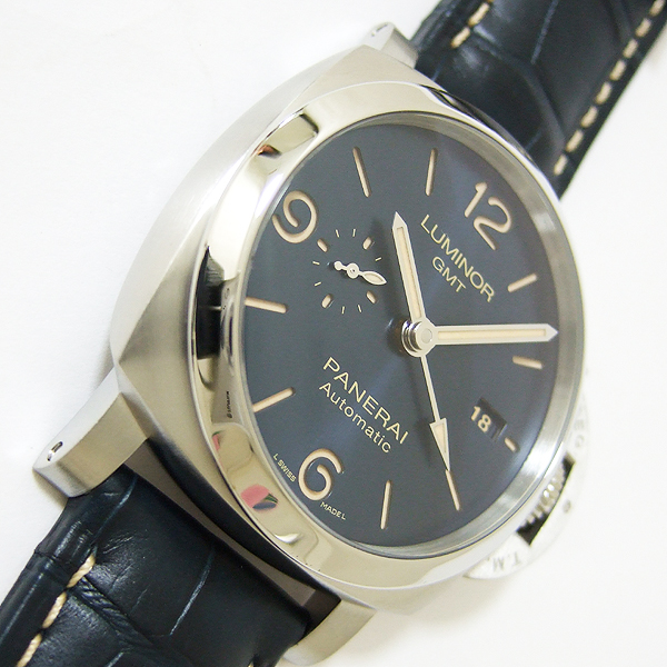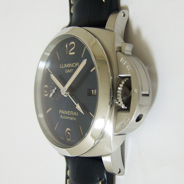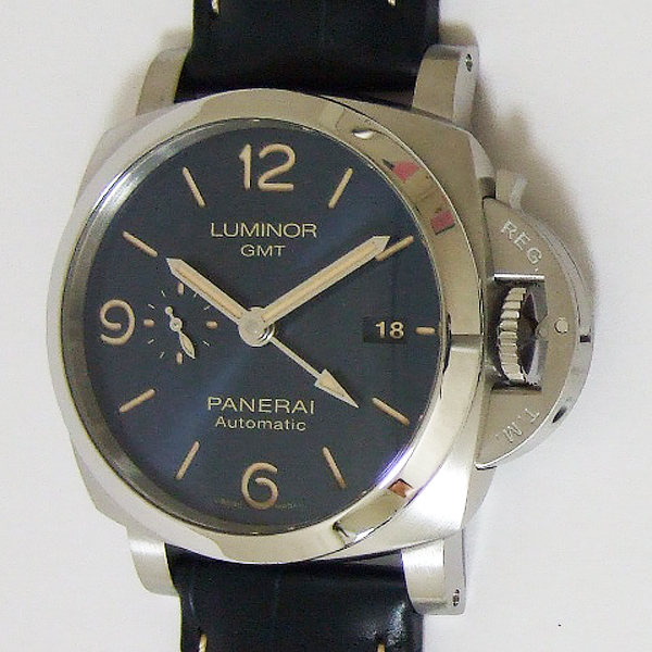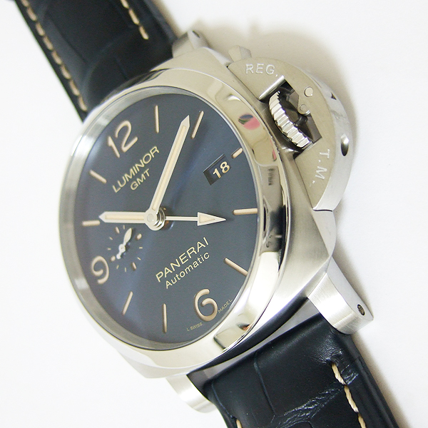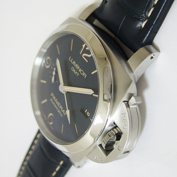 簡述: Luminor GMT 3 Day 自動腕錶/ 型號:PAM-01033/ V 字頭限量1500只(可快拆式錶帶)/ 採用Panerai P.9010 自動上鏈機芯/ 機芯為:13 3/4 法分ˋ 28石ˋ 每小時擺率 28800次ˋ Incabloc防震裝置ˋ 動力儲存 3 日/ 具時ˋ分ˋ小秒針ˋ日期顯示ˋ第 2 地時間指示/ 錶殼44mm 316L 拋光及霧鋼材質/ 藍色錶面(三明治錶盤)/ 舊化夜光時標及指針/ 透明錶背,機芯上有 3 日鍊顯示盤/ 藍寶石水晶鏡面/ 防水達300米/ ㄇ型錶扣/ 附原廠藍色膠帶及藍色鱷魚皮錶帶.