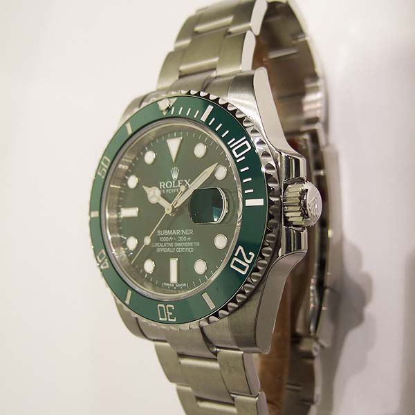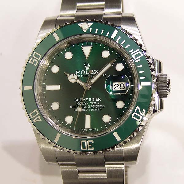 蠔式新款陶瓷合金潛水錶/ 型號:116610LV/ 亂碼字頭/ 採自動上鏈機芯/ 機芯編號:3135, 採用新研發的寶璣式雙層鈮鋯合金藍色鋼,具抗磁效果,31石,五方位調校,雙層合金游絲,四臂環形合金擺輪,四顆微調快慢螺絲,KIF避振裝置,天文台認證(C.O.S.C.)/ 錶徑40mm/ 具時ˋ分ˋ秒針指示及日期顯示/ 綠色面盤/ 夜光指針及時標/ 綠色陶瓷合金單向旋轉潛水計時外圈/ 錶盤內圈刻有一圈防偽ROEX字樣及流水號碼/ 藍寶石水晶玻璃鏡面/ 原廠不繡鋼新式微調式帶扣/ 防水深度潛水達300米.