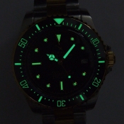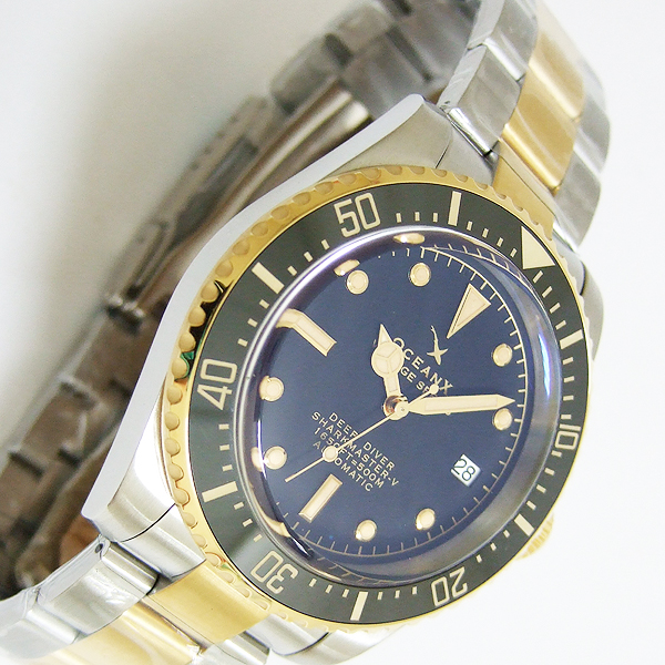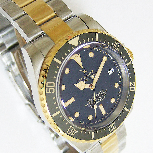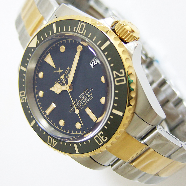 簡述: OCEANX 潛水腕錶/ 型號:VSMS561/ 採 SEIKO NH35 自動上鏈機芯,動力儲存約:41小時, 24 顆紅寶石,28800vph/ 黑色錶盤/ 具時ˋ分ˋ秒及 3 點方位日期視窗/ 金色邊框夜光時標及金色標誌線時標/ 可單向旋轉黑色搭配金色數字刻度陶瓷潛水錶圈,可計算入水時間/ 手錶尺寸: 42 mm,厚:15.3mm/ 藍寶石水晶玻璃/ 全錶 316 L 鋼材質,金色部分為不銹鋼電鍍材質 / 搭配原廠鋼質鏈帶及折疊式錶扣/ 防水 500 米.
