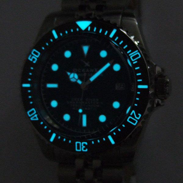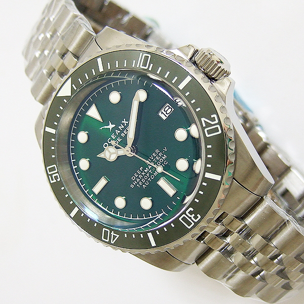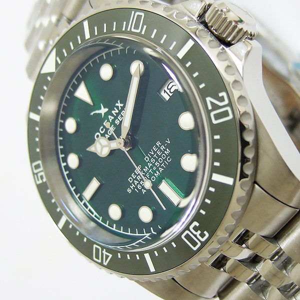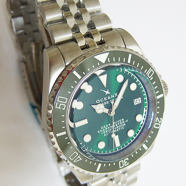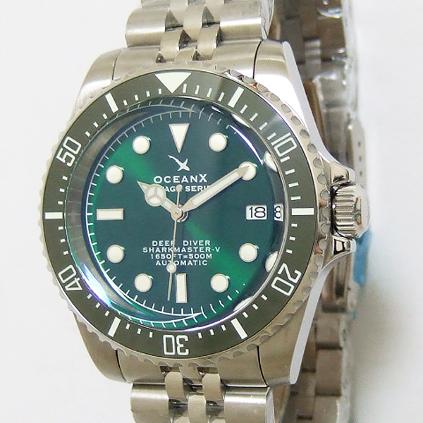 簡述: OCEANX 潛水腕錶/ 型號:VSMS523/ 採 SEIKO NH35 自動上鏈機芯,動力儲存約:41小時, 24 顆紅寶石,28800vph/ 綠色錶盤/ 具時ˋ分ˋ秒及 3 點方位日期視窗/ 銀色邊框夜光時標及白色標誌線時標/ 可單向旋轉深綠色搭配白色數字刻度陶瓷潛水錶圈,可計算入水時間/ 手錶尺寸: 42 mm,厚:15.3mm/ 藍寶石水晶玻璃/ 全錶 316 L 鋼材質 / 搭配原廠鋼質五珠式鏈帶及折疊式錶扣/ 防水 500 米.