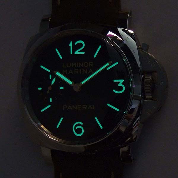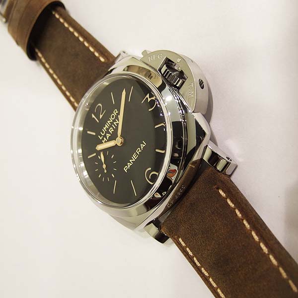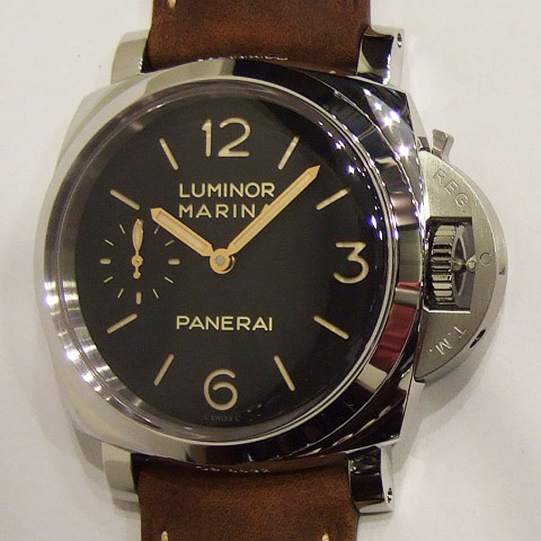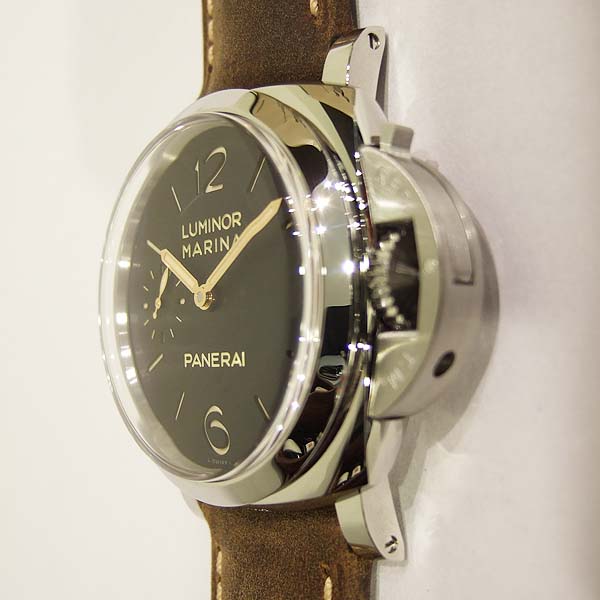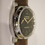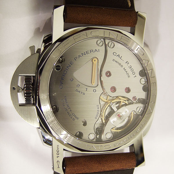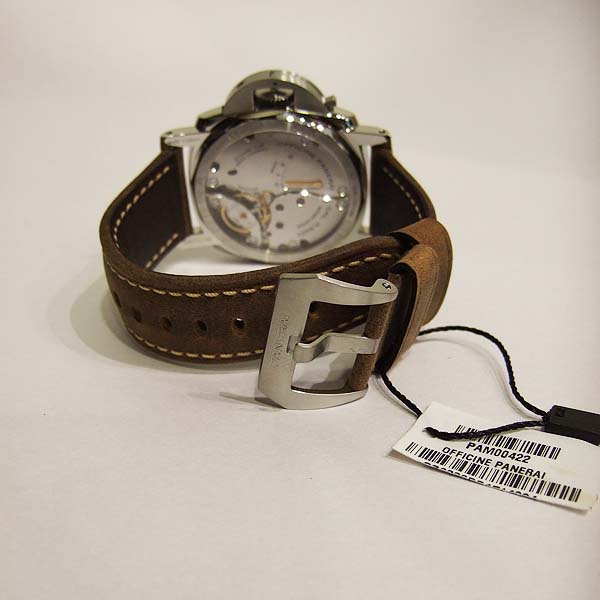 Luminor 1950 3 Day - 47mm 3日鏈動力儲存腕錶/ 型號:PAM00422/ V 字頭限量製作 800 只/ 採自製編號:P.3000 手上鏈機芯, 厚:5.3mm,16 1/2法分, 21石, 2 個發條盒,Glucydur平衡擺輪,每小石震頻 21,600次,Incabloc防震裝置,完全由PANERAI研製/ 具時ˋ分ˋ指示,錶背 3 天動力儲存扇型指示/ 黑色面盤(三明治面盤)/ 夜光指針及時標/ 錶徑: 47 mm/ 精鋼拋亮及霧面錶殼/ 大ㄇ型(普通型)鋼質扣頭/ 特殊專利龍頭護橋(上有REG. 及 T.M.字樣)/ 金魚缸式圓弧形藍寶石水晶鏡面/ 藍寶石水晶透明錶背/ 防水達100米/ 搭配原廠深咖啡色舊化處理牛皮錶帶及黑色橡膠錶帶各 1 條方便自行拆換.