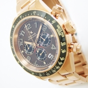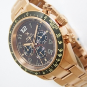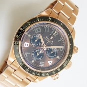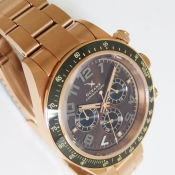簡述: SPEED RACER III CHRONOGRAPH 計時碼錶/ 型號: SRS321 / 採石英機芯/ 具時ˋ分ˋ秒指示/ 60分又60秒計時碼錶功能/ 3 點方位 24 時制顯示盤/ 咖啡色面盤,黑色計時圈/ 銀白色阿拉伯數字時標及標誌型時標/ 玫瑰色指針(具夜光效果)/ 鋼質霧及亮面處理錶殼,玫瑰金色為 5 N PVD ZP 發色處理/ 黑色陶瓷速率錶圈/ 旋入式大型錶冠及計時按鈕/ 手錶尺寸: 41.5mm 錶徑ˋ厚:12.8mm / 藍寶石水晶玻璃鏡面/ 旋入式鋼質底蓋/ 搭配 20mm 原廠鋼質鏈帶及原廠折疊式錶扣/ 防水: 200米.