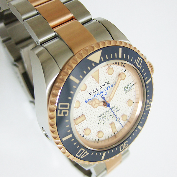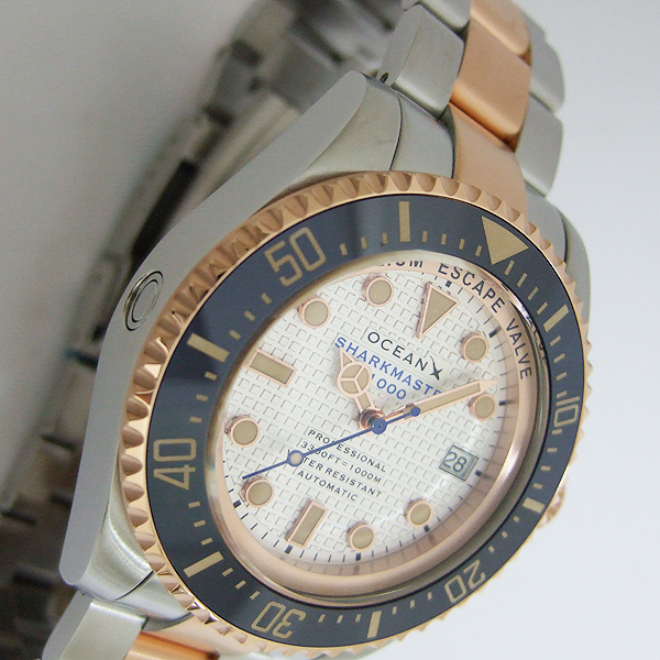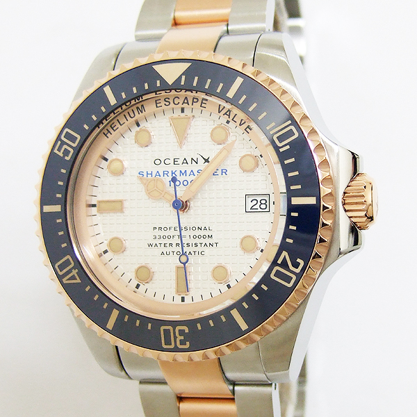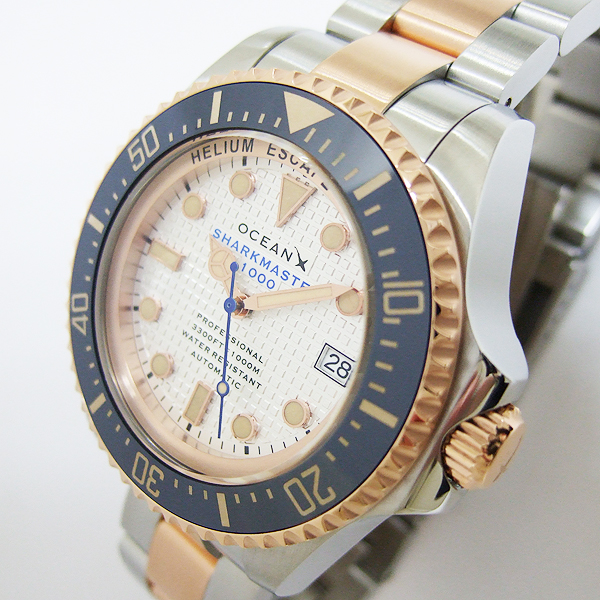 簡述: SHARKMASTER 1000 潛水腕錶/ 型號:SMS1053/ 採 SEIKO NH35 自動上鏈機芯,動力儲存約:41小時, 24 顆紅寶石,21600vph/ 白色格紋錶盤/ 具時ˋ分ˋ秒指示,3點方位日期顯示窗/ 夜光立體時標及標誌線時標/ 可單向旋轉藍色陶瓷潛水錶圈,可計算入水時間/ 手錶尺寸: 44 mm,厚:17.1mm/ 藍寶石水晶玻璃/ 全錶 316 L 鋼材質,玫瑰金色部分為PVD發色處理/ 錶殼左側設有排氦氣閥/ 搭配原廠鋼質鏈帶及折疊式錶扣/ 防水 1000 米.
