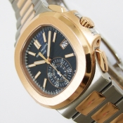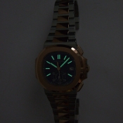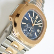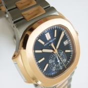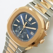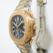 簡述: Patek Philippe 百達翡麗 Nautilus 鸚鵡螺腕錶/ REF:5980/1AR-001/ 採用百達翡麗錶原廠CH 28-520 C自動上鏈機芯, 動能儲存55小時/ 具時ˋ分二針時間指示,日期窗顯示,同軸計時碼錶/ 18K玫瑰金及鋼質錶殼錶帶及摺疊扣/ 旋入式錶冠/ 橫條紋藍色面盤/ 夜光指針/ 立體柱狀時標/ 藍寶石水晶玻璃鏡面及透明錶背/ 錶徑40.5mm / 防水120米 .