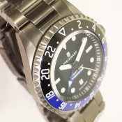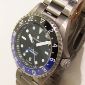簡述: OCEAN GMT Premium 500 腕錶/ 型號:103-0662/ 採瑞士自動上鏈機芯, 21 顆紅寶石, 動力儲存約:40小時/ 具時ˋ分ˋ秒指示及 6 點方位日期顯示,地 2 地時間指示/ 黑色面盤, 6 點方位印有藍底白字 TITANIUM GMT 藍色字樣/ 夜光指針及標誌型時標/ 全錶拋霧鈦合金材質/ 黑及藍色陶瓷材質單向旋轉外圈,可判讀 2 地時間/ 手錶尺寸: 42mm 錶徑,厚: 13 mm , 重 146 克/ 防炫藍寶石水晶水晶玻璃/ 搭配原廠蠔式錶帶及折疊式錶扣/ 防水: 500 米.