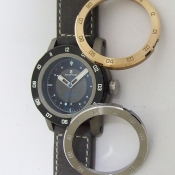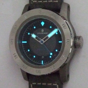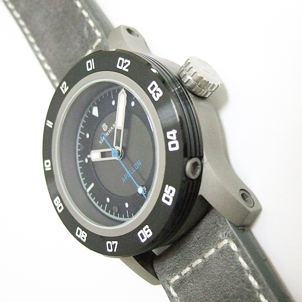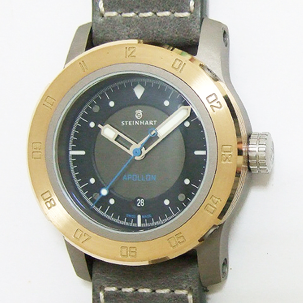簡述: Steinhart 德國品牌潛水錶/ Apollon Automatic 300 米潛水腕錶/ 型號:/ 採瑞士 ETA2824-2 自動上鏈機芯,機芯為:25石,動力儲存:42小時/ 具時ˋ分ˋ秒指示及 6 點方位日期顯示窗/ 黑及灰色面盤/ 夜光指針及標誌型時標/ 錶殼鈦合金搭配拋霧 316 L 不鏽鋼材質表圈(另各加一個黑色DLC鋼質ˋ青銅材質潛水外圈),可計算入水時間/ 手錶尺寸: 45mm 錶徑,厚:17 mm,重:137 克 / 防炫藍寶石水晶玻璃/ 搭配原廠 24mm 軍綠色牛皮錶帶及一般式穿扣/ 防水: 300 米.