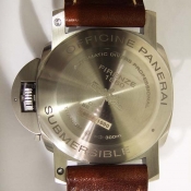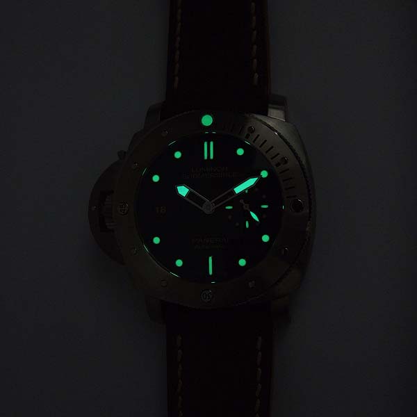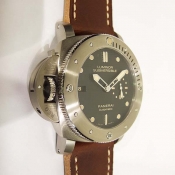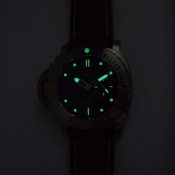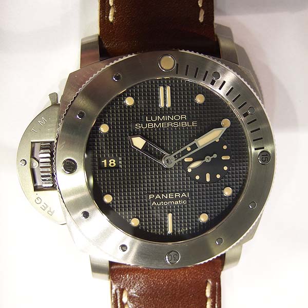 簡述: Luminor Submersible 1950 3 Days Automatic – 47mm 左撇子限量錶/ 型號:PAM00569/ Q 字頭限量製作 1000 只/ 採用沛納海P.9000自動上鏈機芯,機芯完全由沛納海自製,機芯為:13 3/4法分,厚7.9毫米,28石,Glucydur平衡擺輪,每小時震頻28,800次,Incabloc防震裝置,2個發條盒,具72小時動能儲存(3 天)/ 具時ˋ分ˋ小秒指示,日期顯示視窗/ 專利防水錶冠護橋裝置/ 錶徑:47mm,鈦合金錶殼/ 單向逆時針方向旋轉潛水計時錶圈,可計算潛水時間刻度以分鐘為單位的固定爪/ 黑色巴黎釘格紋面盤/ 夜光指針與時標/ 藍寶石水晶鏡面,厚度 4 毫米,具抗訪光塗層/ 錶背刻有人豬潛水載具圖樣/ 防水300米/ 附原廠黑色橡膠帶搭配替代用牛皮錶帶及一般穿扣.