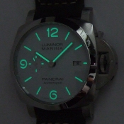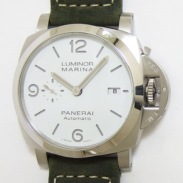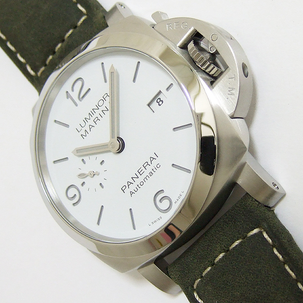 簡述: Luminor 1950 Marina 3 Day 自動腕錶/ 型號:PAM-01314/ W 字頭限量1000只(可快拆式錶帶)/ 採用Panerai P.9010 自動上鏈機芯/ 機芯為:13 3/4 法分ˋ 28石ˋ 每小時擺率 28800次ˋ Incabloc防震裝置ˋ 動力儲存 3 日/ 具時ˋ分ˋ小秒針ˋ日期顯示/ 錶殼44mm 316L 拋光及霧鋼材質/ 白色錶面(三明治錶盤)/ 夜光時標及指針/ 藍寶石水晶鏡面/ 防水達300米/ ㄇ型錶扣/ 附原廠軍綠色牛皮錶帶及綠色橡膠錶帶各 1 條.