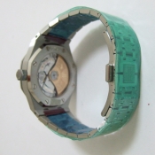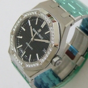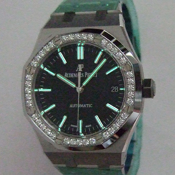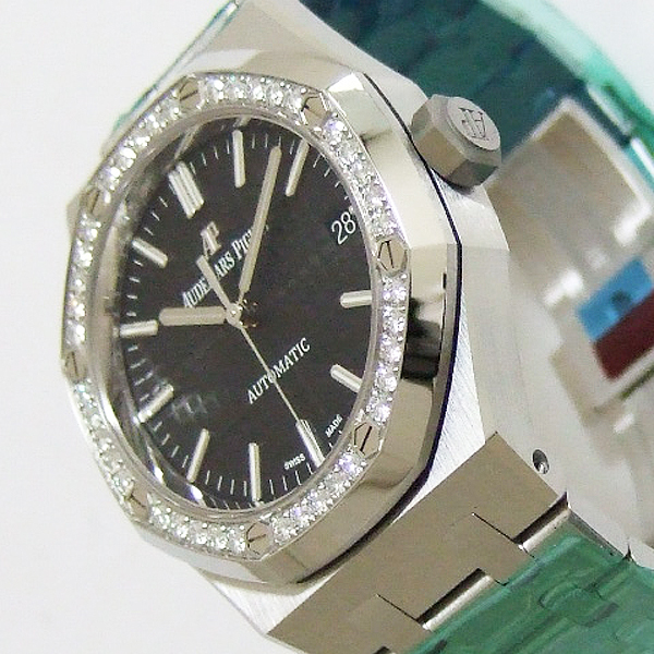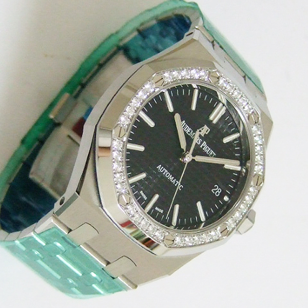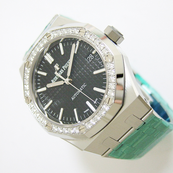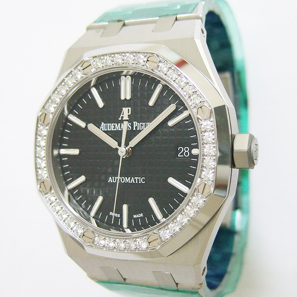 簡述: Audemars Piguet 皇家橡樹錶(Royal Oak)/ 型號:15451ST.ZZ.1256ST.01/ 採自動上鏈機芯/ 錶徑:37mm/ 具時ˋ分ˋ小秒針, 3 點方位日期顯示窗/ 黑色格紋面盤/ 夜光標誌型時標及指針/ 精鋼材質錶殼,八角形螺絲設計錶圈/ 表圈 40 顆明亮式切割鑽石,總重約0.92克拉/ 機芯編號:3120,動力儲存 60 小時/ 藍寶石水晶玻璃/ 防水50米/ 搭配原廠鋼質錶鏈及折疊式錶扣.