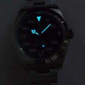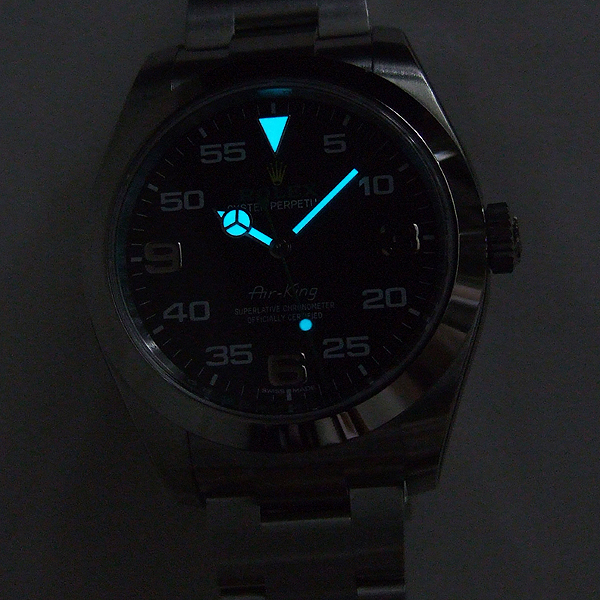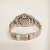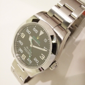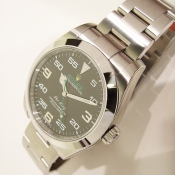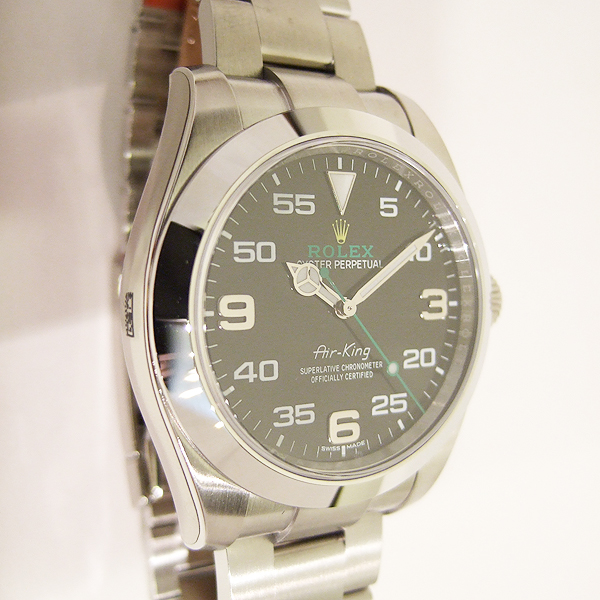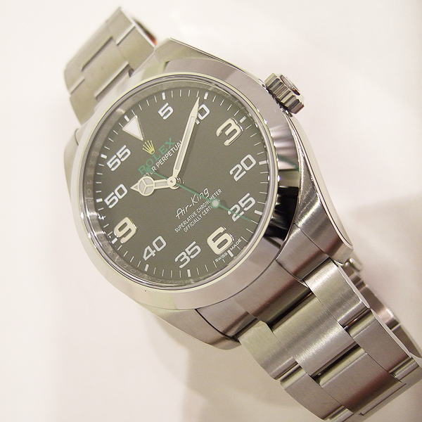 簡述: 蠔式恒動空中霸王型 Air King 腕錶/ 型號:116900/ 亂碼字頭/ 採自動上鏈機芯/ 機芯編號:3131, 具天文台認證(C.O.S.C.),機芯加裝防磁內殼,新的藍色Parachrom游絲,可不受磁場干擾/ 錶徑40mm/ 具時ˋ分ˋ秒針(秒針為綠色針)指示/ 黑色面盤, 12點方位金色黃冠 LOGO ,綠色 ROLEX 字樣/ 夜光指針及12點時標/ 錶盤內圈刻有一圈防偽 ROLEX 字樣及流水號碼/ 藍寶石水晶玻璃鏡面/ 原廠蠔式鏈帶及折疊式錶扣/ 防水100米.