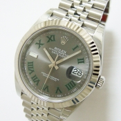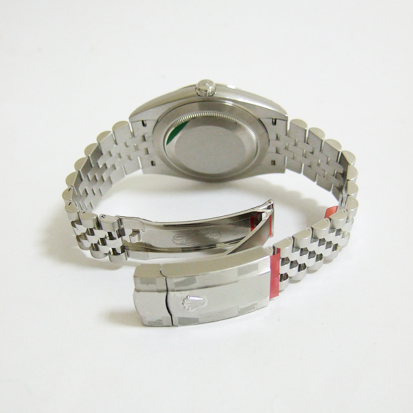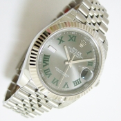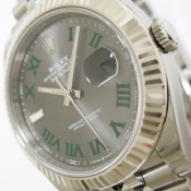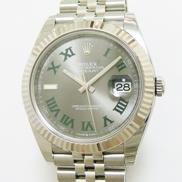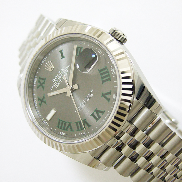 簡述: 勞力士蠔式 DATEJUST 41腕錶/ 型號:126334/ 亂碼字頭/ 採自動上鏈機芯/ 機芯編號:3235, 採用新研發的 CHRONERGY 擒縱系統,五方位調校,配備 PARACHROM游絲的平衡擺輪,四臂環形合金擺輪,四顆微調快慢螺絲,KIF避振裝置,天文台認證(C.O.S.C.)/ 錶徑41mm/ 具時ˋ分ˋ秒針指示及日期放大鏡顯示/ 灰色金屬光面盤搭配綠色羅馬數字刻度/ 夜光指針及時標/ 錶盤內圈刻有一圈防偽 ROLEX 字樣及流水號碼/ 藍寶石水晶玻璃鏡面, 3 點方位設有放大鏡/ 18K白金太陽錶圈/原廠不鏽鋼紀念型鏈帶及折疊式錶扣/ 防水達 100 米.