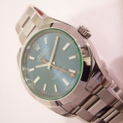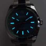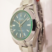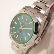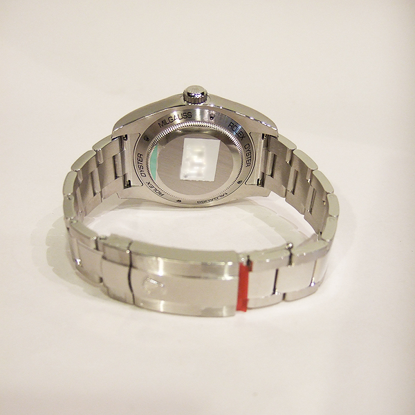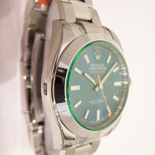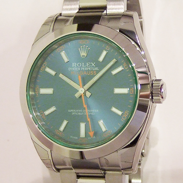 簡述: Milgauss 抗磁腕錶/ 型號:116400 GV/ 亂碼字頭/ 採自動上鏈機芯/ 機芯編號:3130, 具天文台認證(C.O.S.C.)/ 錶徑40mm/ 具時ˋ分ˋ秒針(秒針為橘色閃電針)指示/ 藍色面盤/ 夜光指針及時標/ 錶盤內圈刻有一圈防偽 ROLEX 字樣及流水號碼/ 綠色藍寶石水晶玻璃鏡面/ 原廠蠔式鏈帶及折疊式錶扣/ 防水100米.