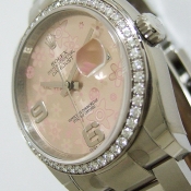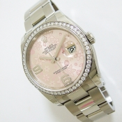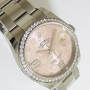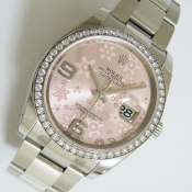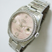 簡述: 勞力士蠔式 DATEJUST 36mm女用鑽錶/ 型號:116244/ 亂碼字頭/ 採自動上鏈機芯/ 機芯編號:3135, ,KIF避振裝置,天文台認證(C.O.S.C.)/ 錶徑 36 mm/ 具時ˋ分ˋ秒針指示及日期放大鏡顯示/ 粉紅色櫻花案紋金屬光面盤搭配阿拉伯數字刻度/ 錶盤內圈刻有一圈防偽 ROLEX 字樣及流水號碼/ 藍寶石水晶玻璃鏡面, 3 點方位設有放大鏡/ 原鑲鑽石錶圈/ 原廠不鏽鋼蠔式鏈帶及折疊式錶扣/ 防水達 100 米.