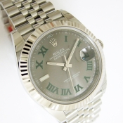 簡述: 勞力士蠔式 DATEJUST 41腕錶/ 型號:126334/ 亂碼字頭/ 採自動上鏈機芯/ 機芯編號:3235, 採用新研發的 CHRONERGY 擒縱系統,五方位調校,配備 PARACHROM游絲的平衡擺輪,四臂環形合金擺輪,四顆微調快慢螺絲,KIF避振裝置,天文台認證(C.O.S.C.)/ 錶徑41mm/ 具時ˋ分ˋ秒針指示及日期放大鏡顯示/ 灰色金屬光面盤搭配綠色羅馬數字刻度/ 夜光指針及時標/ 錶盤內圈刻有一圈防偽 ROLEX 字樣及流水號碼/ 藍寶石水晶玻璃鏡面, 3 點方位設有放大鏡/ 18K白金太陽錶圈/原廠不鏽鋼紀念型鏈帶及折疊式錶扣/ 防水達 100 米.