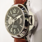簡述: Luminor GMT 腕錶/ 型號:00088/ I 字頭限量 3000 只/ 機蕊為獨特 PANERAI OP VIII自動上鏈機械式機蕊/ 機芯為:13又1/4法分,21石,震頻28800,錶橋與擺重刻有PANERAI字樣,42小時動能儲存,具天文台認證( C.O.S.C)/ 錶徑:44mm/ 黑色錶面ˋ夜光時標與指針/ 藍寶石水晶鏡面/ 防水300米/ 附替代用牛皮壓紋錶帶一條及原廠折疊式錶扣.