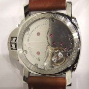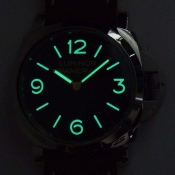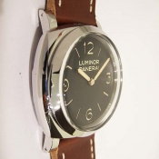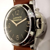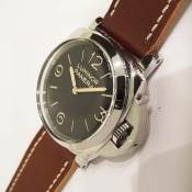 簡述: Luminor 1950 3 Day - 47mm 3日鏈腕錶/ 型號:PAM00372/ N 字頭限量製作3500只/ 採自製編號:P.3000 手上鏈機芯, 厚:5.3mm,16 1/2法分, 21石, 2 個發條盒,Glucydur平衡擺輪,每小石震頻 21,600次,Incabloc防震裝置,完全由PANERAI研製/ 具時ˋ分ˋ指示/ 黑色面盤(三明治面盤)/ 夜光指針及時標/ 錶徑: 47 mm/ 精鋼拋亮及霧面錶殼/ 大ㄇ型(普通型)鋼質扣頭/ 特殊專利龍頭護橋(上有REG. 及 T.M.字樣)/ 金魚缸式圓弧形 P lexiglas 樹脂玻璃(厚度3毫米)/ 藍寶石水晶透明錶背/ 防水達100米/ 搭配原廠深咖啡色舊化處理牛皮錶帶及棕色牛皮帶各 1 條方便自行拆換.