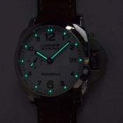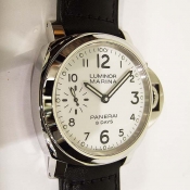 簡述: Luminor Marina 8 Days-44mm 系列腕錶/ 型號:PAM00563/ R 字頭限量1000只/ 採Panerai自製 P5000 手上鏈機芯/ 機芯為:15 3/4法分ˋ21石ˋ厚4.5毫米ˋ每小時擺率21600次ˋKIF 防震裝置ˋ動力儲存 8 日ˋ2個發條盒ˋ127個零件/ 白色面盤/ 夜光時標及指針/ 錶殼 44mm 亮面 AISI 316L 鋼材質/ 特殊專利龍頭護橋/ 藍寶石水晶玻璃(厚度2.5毫米)具抗反光塗層/ 透明錶背可見機芯/ 防水達300米/ 附替代用黑色牛皮錶帶,搭配梯形穿扣。