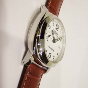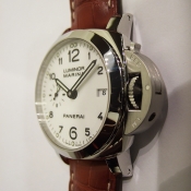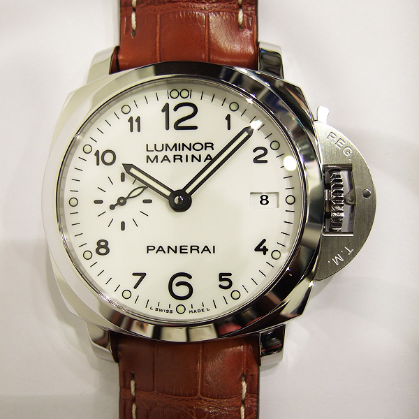簡述: Luminor 1950 Marina 3 Day - 42mm 自動腕錶/ 型號:PAM-00523/ R 字頭限量 2000 只(可快拆式錶帶)/ 採用Panerai P.9000 自動上鏈機芯/ 機芯為:13 3/4 法分ˋ 28石ˋ 每小時擺率 28800次ˋ Incabloc防震裝置ˋ 動力儲存 3 日/ 具時ˋ分ˋ小秒針ˋ日期顯示/ 錶殼42mm 316L 拋光及霧鋼材質/ 白色錶面/ 黑色阿拉伯數字時標,夜光圓點時標及指針/ 藍寶石水晶鏡面/ 防水達300米/ 小ㄇ型錶扣/ 附咖啡色鱷魚皮錶帶.