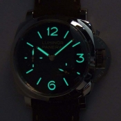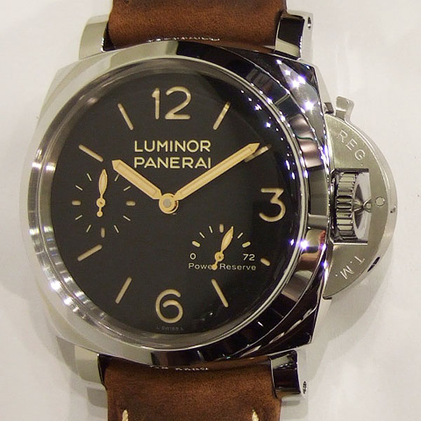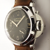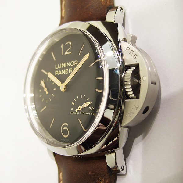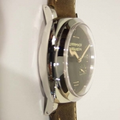 簡述: Luminor 1950 3 Day - 47mm 3日鏈動力儲存腕錶/ 型號:PAM00423/ V 字頭限量製作800只/ 採自製編號:P.3000 手上鏈機芯, 厚:5.3mm,16 1/2法分, 21石, 2 個發條盒,Glucydur平衡擺輪,每小石震頻 21,600次,Incabloc防震裝置,完全由PANERAI研製/ 具時ˋ分ˋ指示,錶面 72 小時動力儲存扇型指示/ 黑色面盤(三明治面盤)/ 夜光指針及時標/ 錶徑: 47 mm/ 精鋼拋亮及霧面錶殼/ 大ㄇ型(普通型)鋼質扣頭/ 特殊專利龍頭護橋(上有REG. 及 T.M.字樣)/ 金魚缸式圓弧形藍寶石水晶鏡面/ 藍寶石水晶透明錶背/ 防水達100米/ 搭配原廠深咖啡色舊化處理牛皮錶帶及替代用黑色橡膠錶帶各 1 條方便自行拆換.