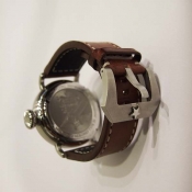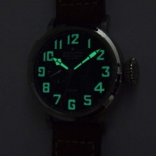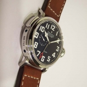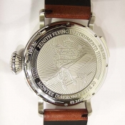 簡述: Pilot 系列飛行員軍錶/ 型號: F 0309/ 採 Zenith 自製自動上鏈機芯/ 機芯為:26石,動力儲存約:50小時/ 具時ˋ分ˋ秒指示及G.M.T兩地時間功能/ 黑色面盤/ 白色阿拉伯數字及標誌線時標(具夜光效果)/ 拋光鋼質錶殼,鋼質後底蓋(刻有飛行器圖樣)/ 大型軍錶錶冠/ 手錶尺寸: 48mm(含第 2 地時間調整按鈕) 錶徑ˋ厚:13.2mm/ AR 防眩藍寶石水晶玻璃鏡面/ 搭配 24mm 咖啡牛皮錶帶/ ㄇ字錶扣/ 防水: 100米.