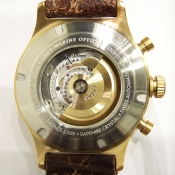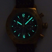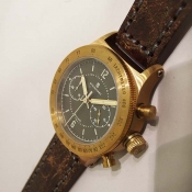 Marine-Officer Bronze 44 mm 甲板觀測官計時碼錶/ 型號:108-0235 / 採瑞士 ETA 2824-2自動上鏈機芯,機芯有49顆紅寶石/ 具時ˋ分ˋ秒指示/ 計時碼錶功能/ 綠色面盤/ 夜光阿拉伯數字及標誌線時標/ 銅色計時碼錶指針/ 銅質霧面處理錶殼/ 大型軍錶錶冠/ 手錶尺寸: 44mm 錶徑ˋ厚:16mmˋ重 135 公克 / AR 塗層防眩藍寶石水晶玻璃鏡面(內部邊緣是抗反射的刃角)/ 透明底蓋/ 搭配 22mm 咖啡色軍錶帶/ 原廠ㄇ型(一般)錶扣/ 防水: 30米. |